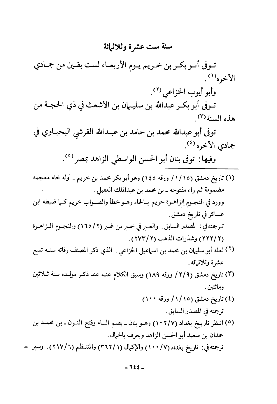 سنة سِتّ عشرَة وثلاثمائة توفّي أَبُو بكر بن خريم يَوْم الْأَرْبَعَاء لست بَقينَ من جمادي الْآخِرَة وَأَبُو أَيُّوب الْخُزَاعِيّ توفّي أَبُو بكر عبد الله بن سُلَيْمَان بن الْأَشْعَث فِي ذِي الْحجَّة من هَذِه السّنة توفّي أَبُو عبد الله مُحَمَّد بن حَامِد بن عبد الله الْقرشِي اليحياوي فِي جمادي الْآخِرَه وفيهَا توفّي بنان أَبُو الْحسن الوَاسِطِيّ الزَّاهِد بِمصْر
