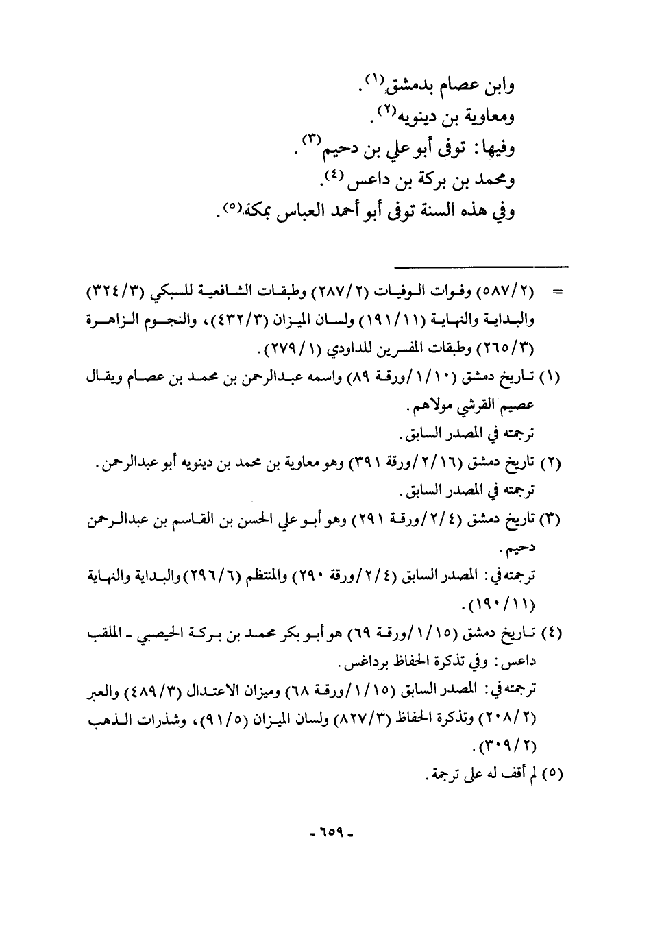 وَابْن عِصَام بِدِمَشْق وَمُعَاوِيَة بن دينويه وفيهَا توفّي أَبُو عَليّ بن دُحَيْم وَمُحَمّد بن بركَة بن داعس وَفِي هَذِه السّنة توفّي أَبُو أَحْمد الْعَبَّاس بِمَكَّة