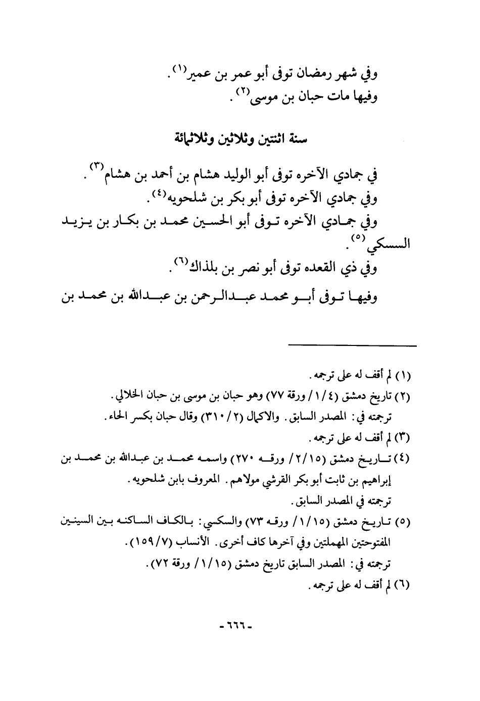 سنة اثْنَتَيْنِ وَثَلَاثِينَ وثلاثمائة فِي جمادي الْآخِرَه توفّي أَبُو الْوَلِيد هِشَام بن أَحْمد بن هِشَام وَفِي جمادي الْآخِرَه توفّي أَبُو بكر بن شلحويه وَفِي جمادي الْآخِرَه توفّي أَبُو الْحُسَيْن مُحَمَّد بن بكار بن يزِيد السسكي وَفِي ذِي القعده توفّي ابو نصر بن بلذاك وفيهَا توفّي أَبُو مُحَمَّد عبد الرَّحْمَن بن عبد الله بن مُحَمَّد بن