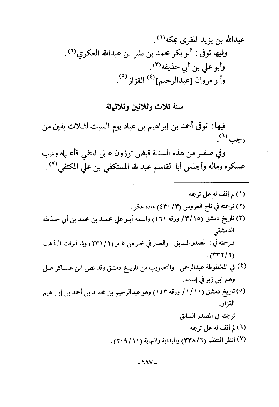 سنة ثَلَاث وَثَلَاثِينَ وثلاثمائة فِيهَا توفّي أَحْمد بن إِبْرَاهِيم بن عباد يَوْم السبت لثلاث بَقينَ من رَجَب وَفِي صفر من هَذِه السّنة قبض توزون على المتقي فأعماه وَنهب عسكره وَمَاله وأجلس أَبَا الْقَاسِم عبد الله المستكفي بن عَليّ المكتفي