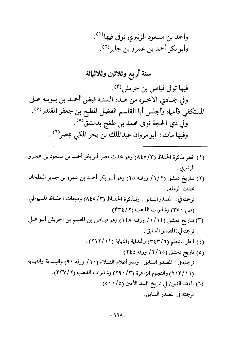 سنة أَربع وَثَلَاثِينَ وثلاثمائة فِيهَا توفّي فياض بن حريش وَفِي جمادي الاخره من هَذِه السّنة قبض أَحْمد بن بويه على المستكفي فأعماه وأجلس أَبَا الْقَاسِم الْفضل الْمُطِيع بن جَعْفَر المقتدر وَفِي ذِي الْحجَّة توفّي مُحَمَّد بن طغج بِدِمَشْق وفيهَا مَاتَ أَبُو مَرْوَان عبد الْملك بن بَحر الْمَكِّيّ بِمصْر