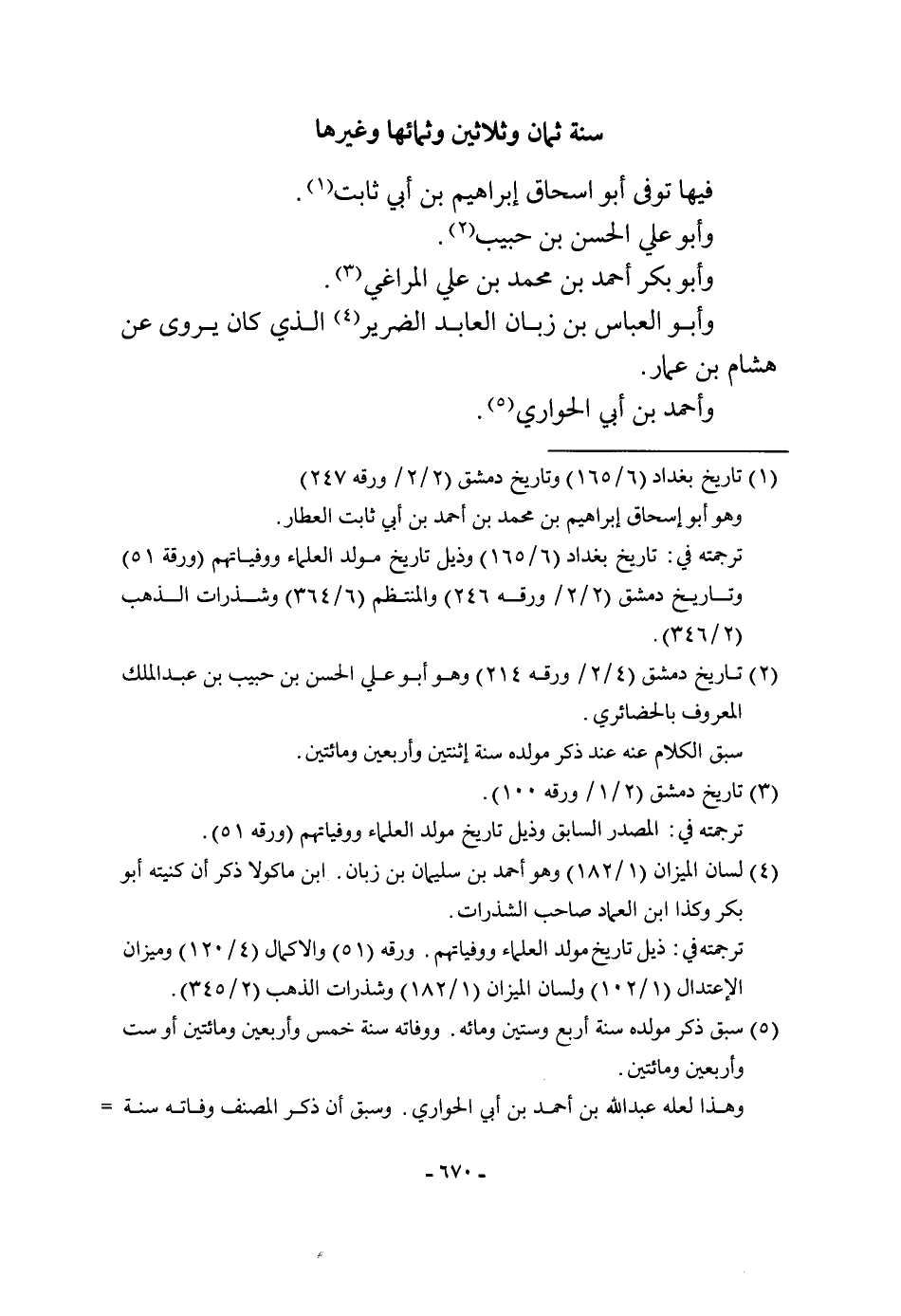 سنة ثَمَان وَثَلَاثِينَ وثمائها وَغَيرهَا فِيهَا توفّي أَبُو اسحاق إِبْرَهِيمُ بن أبي ثَابت وابو عَليّ الْحسن بن حبيب وَأَبُو بكر أَحْمد بن مُحَمَّد بن عَليّ المراغي وَأَبُو الْعَبَّاس بن زبان العابد الضَّرِير الَّذِي كَانَ يروي عَن هِشَام بن عمار وَأحمد بن أبي الْحوَاري