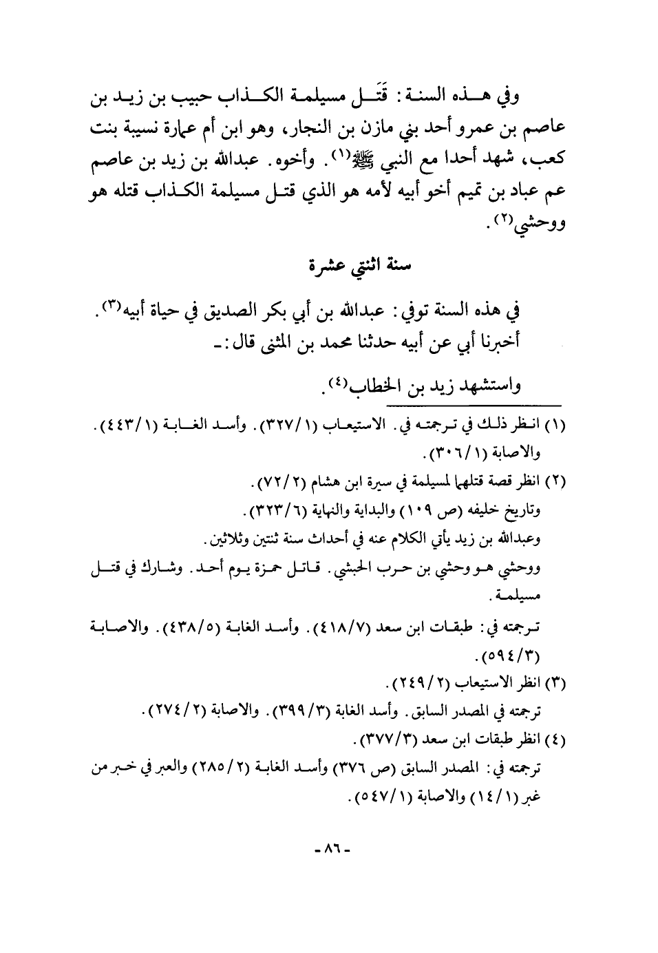 وَفِي هَذِه السّنة قتل مُسَيْلمَة الْكذَّاب حبيب بن زيد بن عَاصِم بن عَمْرو أحد بني مَازِن بن النجار وَهُوَ ابْن أم عمَارَة نسيبة بنت كَعْب شهد أحدا مَعَ النَّبِي صلى الله عَلَيْهِ وَسلم وَأَخُوهُ عبد الله بن زيد بن عَاصِم عَم عباد بن تَمِيم أَخُو أَبِيه لأمه هُوَ الَّذِي قتل مُسَيْلمَة الْكذَّاب قَتله هُوَ وَوَحْشِي