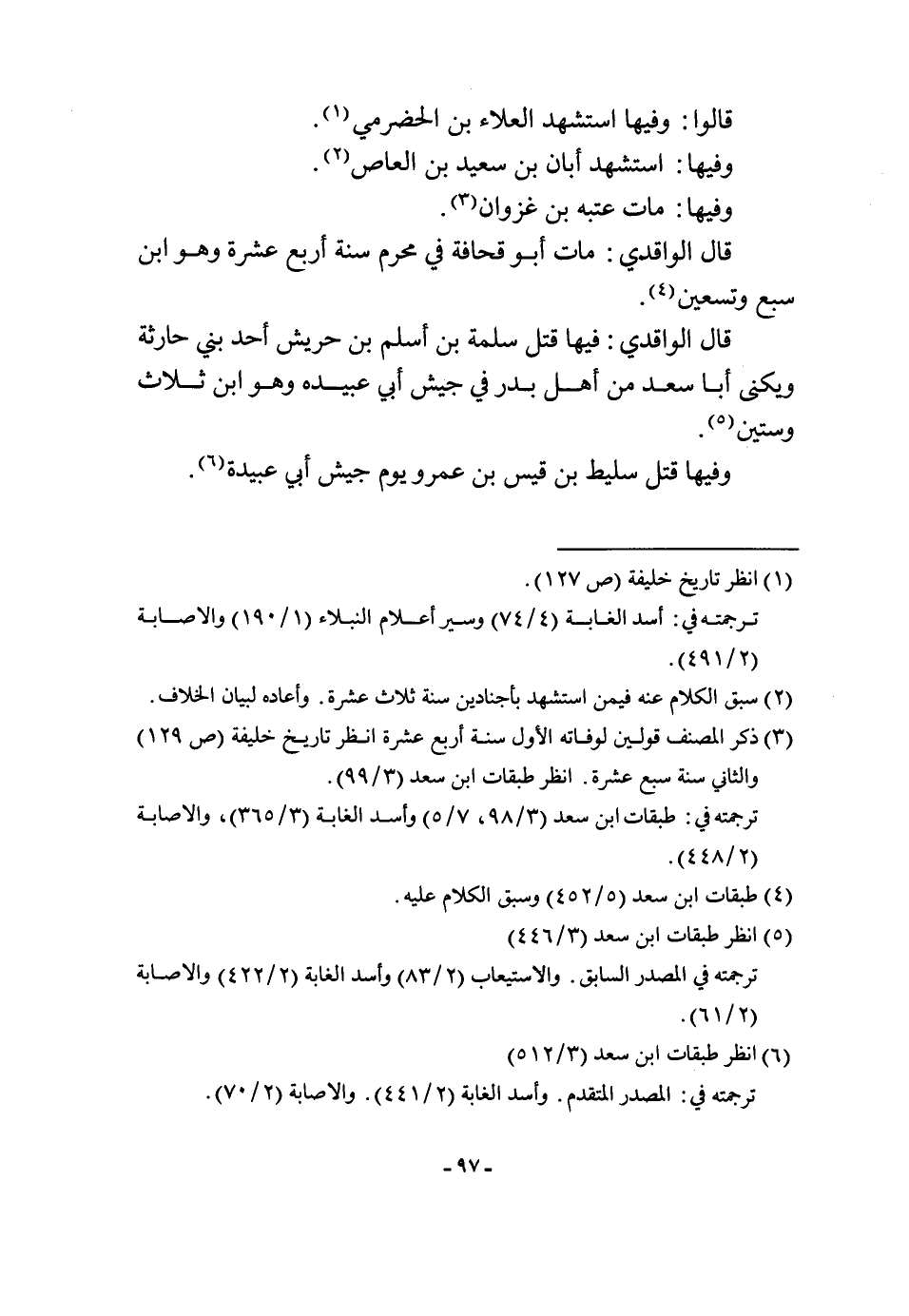قَالَ الْوَاقِدِيّ فِيهَا قتل سَلمَة بن أسلم بن حريش أحد بني حَارِثَة ويكنى أَبَا سعد من أهل بدر فِي جَيش أبي عُبَيْدَة وَهُوَ ابْن ثَلَاث وَسِتِّينَ
