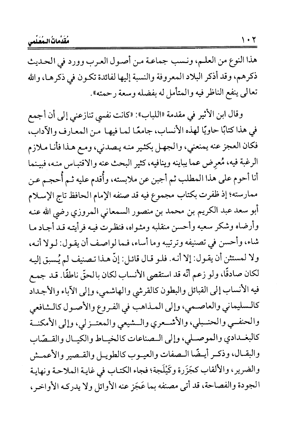 وقال ابن الأثير في مقدمة "اللباب": "كانت نفسي تنازعني إلى أن أجمع في هذا كتابًا حاويًا لهذه الأنساب، جامعًا لما فيها من المعارف والآداب، فكان العجز عنه يمنعني، والجهل بكثير منه يصدني، ومع هذا فأنا ملازم الرغبة فيه، مُعرِض عما يباينه وينافيه، كثير البحث عنه والاقتباس منه، فبينما أنا أحوم على هذا المطلب ثم أجبن عن ملابسته، وأُقدم عليه ثم أُحجم عن ممارسته؛ إذ ظفرت بكتاب مجموع فيه قد صنفه الإمام الحافظ تاج الإسلام أبو سعد عبد الكريم بن محمد بن منصور السمعاني المروزي رضي الله عنه وأرضاه وشكر سعيه وأحسن منقلبه ومثواه، فنظرت فيه فرأيته قد أجاد ما شاء، وأحسن في تصنيفه وترتيبه وما أساء، فما لواصف أن يقول: لولا أنه، ولا لمستثن أن يقول: إلا أنه. فلو قال قائل: إنّ هذا تصنيف لم يُسبق إليه لكان صادقًا، ولو زعم أنّه قد استقصى الأنساب لكان بالحقّ ناطقًا. قد جمع فيه الأنساب إلى القبائل والبطون كالقرشي والهاشمي، وإلى الآباء والأجداد كالسليماني والعاصمي، وإلى المذاهب في الفروع والأصول كالشافعي والحنفي والحنبلي، والأشعري والشيعي والمعتزلي، وإلى الأمكنة كالبغدادي والموصلي، وإلى الصناعات كالخياط والكيال والقصّاب والبقال، وذكر أيضًا الصفات والعيوب كالطويل والقصير والأعمش والضرير، والألقاب كجَزَرة وكَيْلَجة؛ فجاء الكتاب في غاية الملاحة ونهاية الجودة والفصاحة، قد أتى مصنفه بما عَجَز عنه الأوائل ولا يدركه الأواخر،