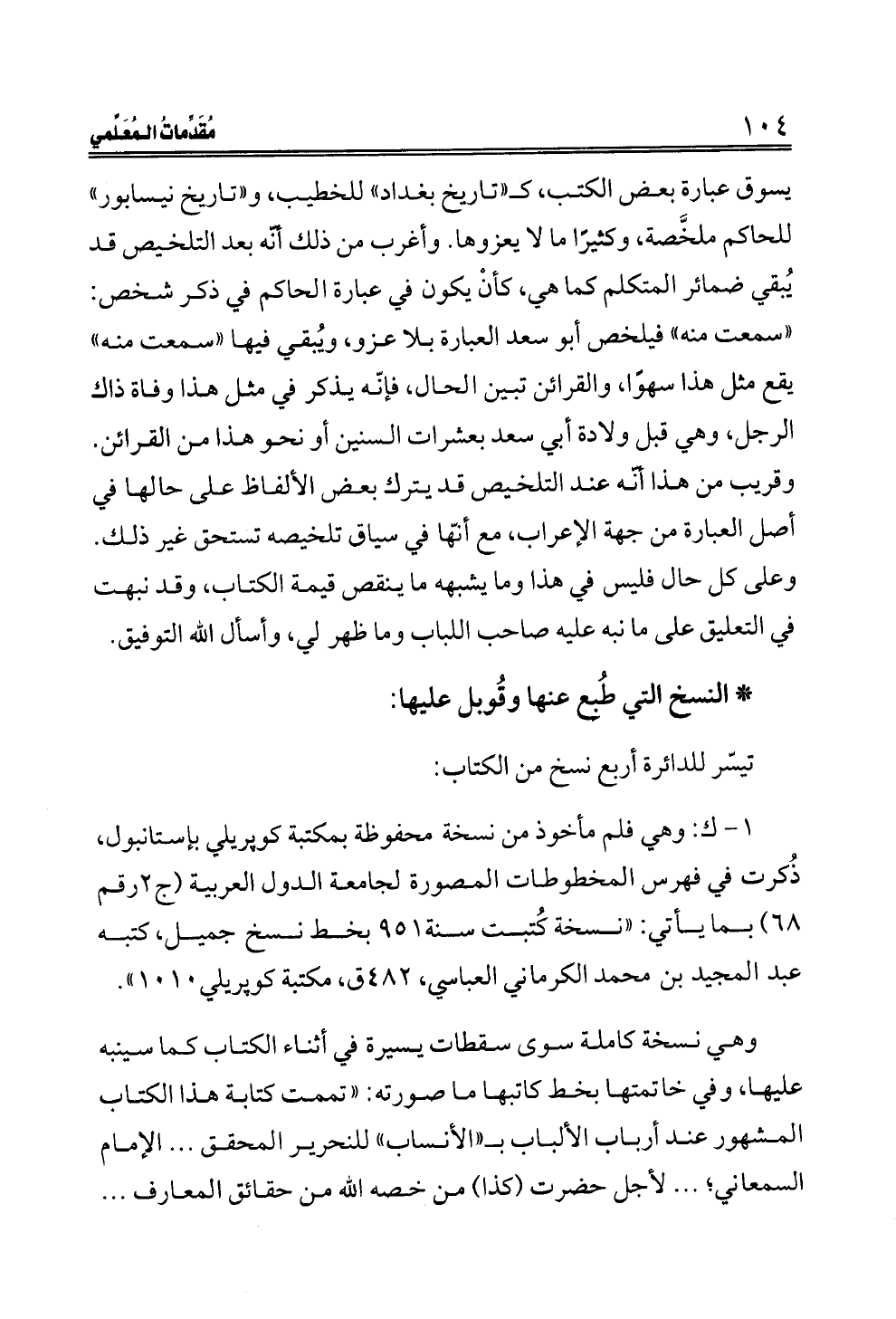 يسوق عبارة بعض الكتب، كـ"تاريخ بغداد" للخطيب، و"تاريخ نيسابور" للحاكم ملخَّصة، وكثيرًا ما لا يعزوها. وأغرب من ذلك أنّه بعد التلخيص قد يُبقي ضمائر المتكلم كما هي، كأنْ يكون في عبارة الحاكم في ذكر شخص: "سمعت منه" فيلخص أبو سعد العبارة بلا عزو، ويُبقي فيها "سمعت منه" يقع مثل هذا سهوًا، والقرائن تبين الحال، فإنّه يذكر في مثل هذا وفاة ذاك الرجل، وهي قبل ولادة أبي سعد بعشرات السنين أو نحو هذا من القرائن. وقريب من هذا أنّه عند التلخيص قد يترك بعض الألفاظ على حالها في أصل العبارة من جهة الإعراب، مع أنّها في سياق تلخيصه تستحق غير ذلك. وعلى كل حال فليس في هذا وما يشبهه ما ينقص قيمة الكتاب، وقد نبهت في التعليق على ما نبه عليه صاحب اللباب وما ظهر لي، وأسأل الله التوفيق.