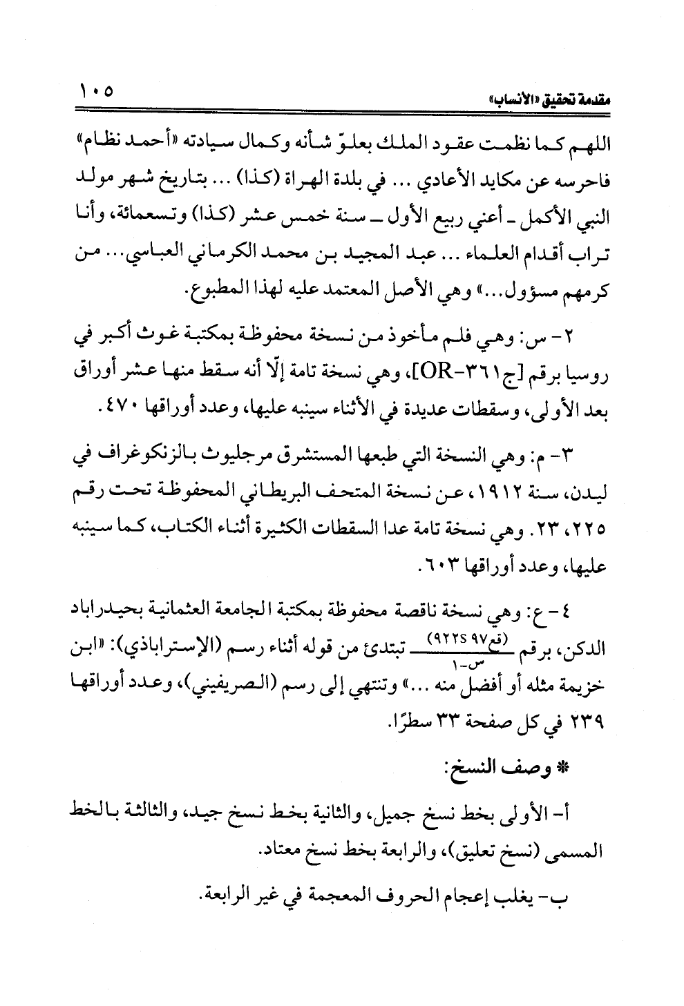 ٤ - ع: وهي نسخة ناقصة محفوظة بمكتبة الجامعة العثمانية بحيدراباد الدكن، برقم ــ تبتدئ من قوله أثناء رسم (الإستراباذي): "ابن خزيمة مثله أو أفضل منه ... " وتنتهي إلى رسم (الصريفيني)، وعدد أوراقها ٢٣٩ في كل صفحة ٣٣ سطرًا.