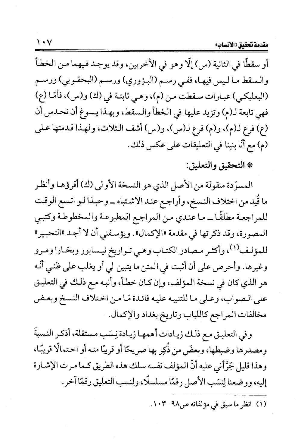 المسوّدة منقولة من الأصل الذي هو النسخة الأولى (ك) أقرؤها وأنظر ما قُيد من اختلاف النسخ، وأراجع عند الاشتباه ــ وحبذا لو اتسع الوقت للمراجعة مطلقًا ــ ما عندي من المراجع المطبوعة والمخطوطة وكتبي المصورة، وقد ذكرتها في مقدمة "الإكمال". ويؤسفني أن لا أجد "التحبير" للمؤلف (¬١)، وأكثر مصادر الكتاب وهي تواريخ نيسابور وبخارا ومرو وغيرها. وأحرص على أن أثبت في المتن ما يتبين لي أو يغلب على ظني أنّه هو الذي كان في نسخة المؤلف، وإن كان خطأ، وأنبه مع ذلك في التعليق على الصواب، وعلى ما للتنبيه عليه فائدة مّا من اختلاف النسخ وبعض مخالفات المراجع كاللباب وتاريخ بغداد والإكمال.