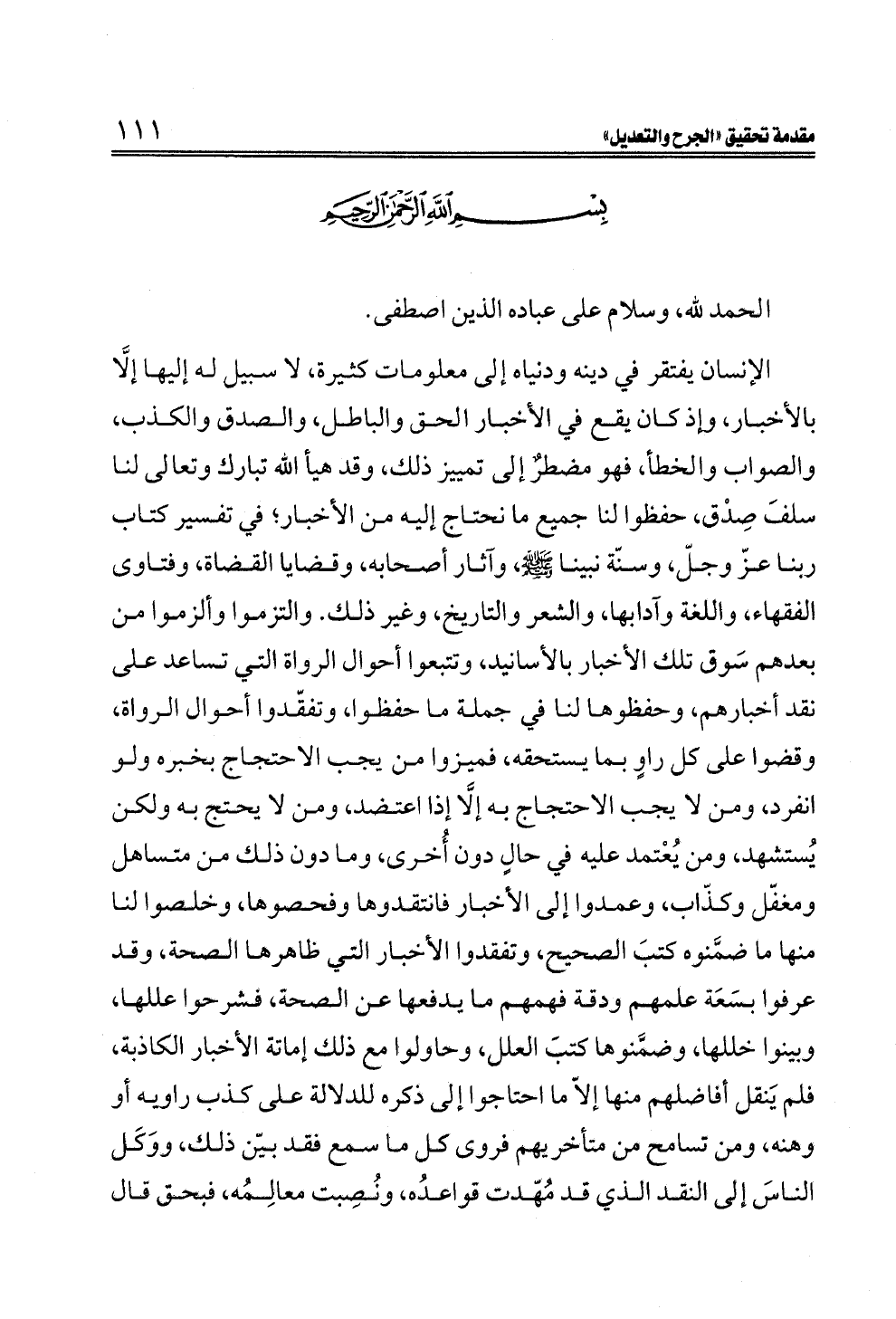 الإنسان يفتقر في دينه ودنياه إلى معلومات كثيرة، لا سبيل له إليها إلَّا بالأخبار، وإذ كان يقع في الأخبار الحق والباطل، والصدق والكذب، والصواب والخطأ، فهو مضطرٌ إلى تمييز ذلك، وقد هيأ الله تبارك وتعالى لنا سلفَ صِدْق، حفظوا لنا جميع ما نحتاج إليه من الأخبار؛ في تفسير كتاب ربنا عزّ وجلّ، وسنّة نبينا - صلى الله عليه وسلم - ، وآثار أصحابه، وقضايا القضاة، وفتاوى الفقهاء، واللغة وآدابها، والشعر والتاريخ، وغير ذلك. والتزموا وألزموا من بعدهم سَوق تلك الأخبار بالأسانيد، وتتبعوا أحوال الرواة التي تساعد على نقد أخبارهم، وحفظوها لنا في جملة ما حفظوا، وتفقّدوا أحوال الرواة، وقضوا على كل راوٍ بما يستحقه، فميزوا من يجب الاحتجاج بخبره ولو انفرد، ومن لا يجب الاحتجاج به إلَّا إذا اعتضد، ومن لا يحتج به ولكن يُستشهد، ومن يُعْتمد عليه في حالٍ دون أُخرى، وما دون ذلك من متساهل ومغفّل وكذّاب، وعمدوا إلى الأخبار فانتقدوها وفحصوها، وخلصوا لنا منها ما ضمَّنوه كتبَ الصحيح، وتفقدوا الأخبار التي ظاهرها الصحة، وقد عرفوا بسَعَة علمهم ودقة فهمهم ما يدفعها عن الصحة، فشرحوا عللها، وبينوا خللها، وضمَّنوها كتبَ العلل، وحاولوا مع ذلك إماتة الأخبار الكاذبة، فلم يَنقل أفاضلهم منها إلاّ ما احتاجوا إلى ذكره للدلالة على كذب راويه أو وهنه، ومن تسامح من متأخريهم فروى كل ما سمع فقد بيّن ذلك، ووَكَل الناسَ إلى النقد الذي قد مُهّدت قواعدُه، ونُصِبت معالِمُه، فبحق قال