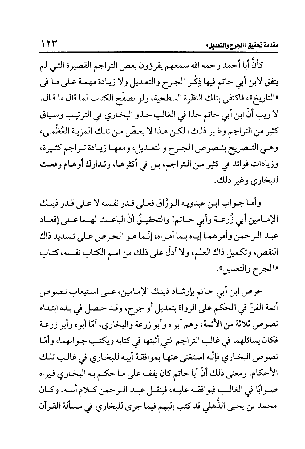 وأما جواب ابن عبدويه الورَّاق فعلى قدر نفسه لا على قدر ذينك الإمامين أبي زُرعة وأبي حاتم! والتحقيقُ أنّ الباعث لهما على إقعاد عبد الرحمن وأمرهما إياه بما أمراه، إنّما هو الحرص على تسديد ذاك النقص، وتكميل ذاك العلم، ولا أدلّ على ذلك من اسم الكتاب نفسه، كتاب "الجرح والتعديل".