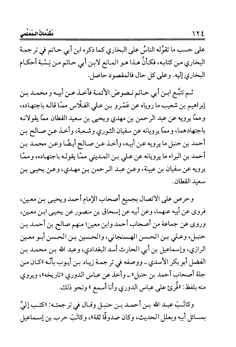 ثم تتبَّع ابن أبي حاتم نصوصَ الأئمة فأخذ عن أبيه ومحمد بن إبراهيم بن شعيب ما روياه عن عَمْرو بن علي الفلّاس ممّا قاله باجتهاده، وممّا يرويه عن عبد الرحمن بن مهدي ويحيى بن سعيد القطان ممّا يقولانه باجتهادهما، وممّا يرويانه عن سفيان الثوري وشعبة، وأخذ عن صالح بن أحمد بن حنبل ما يرويه عن أبيه، وأخذ عن صالح أيضًا وعن محمد بن أحمد بن البراء ما يرويانه عن علي بن المديني ممّا يقوله باجتهاده، وممّا يرويه عن سفيان بن عيينة، وعن عبد الرحمن بن مهدي، وعن يحيى بن سعيد القطان.