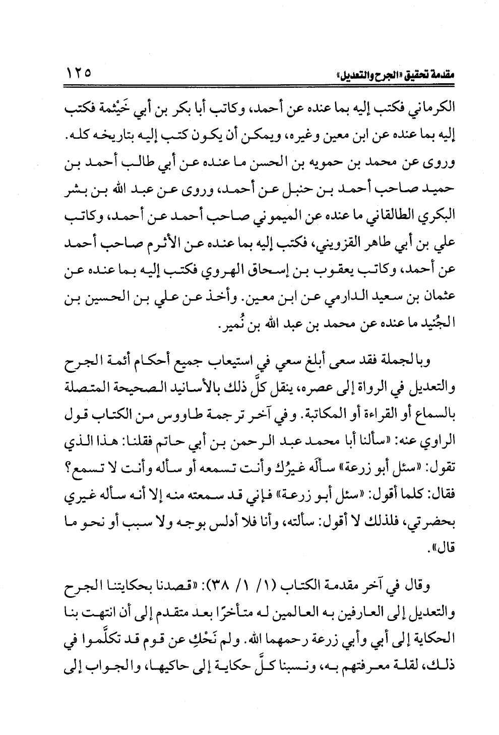 وقال في آخر مقدمة الكتاب (١/ ١/ ٣٨): "قصدنا بحكايتنا الجرح والتعديل إلى العارفين به العالمين له متأخرًا بعد متقدم إلى أن انتهت بنا الحكاية إلى أبي وأبي زرعة رحمهما الله. ولم نَحْكِ عن قوم قد تكلَّموا في ذلك، لقلة معرفتهم به، ونسبنا كلَّ حكاية إلى حاكيها، والجواب إلى