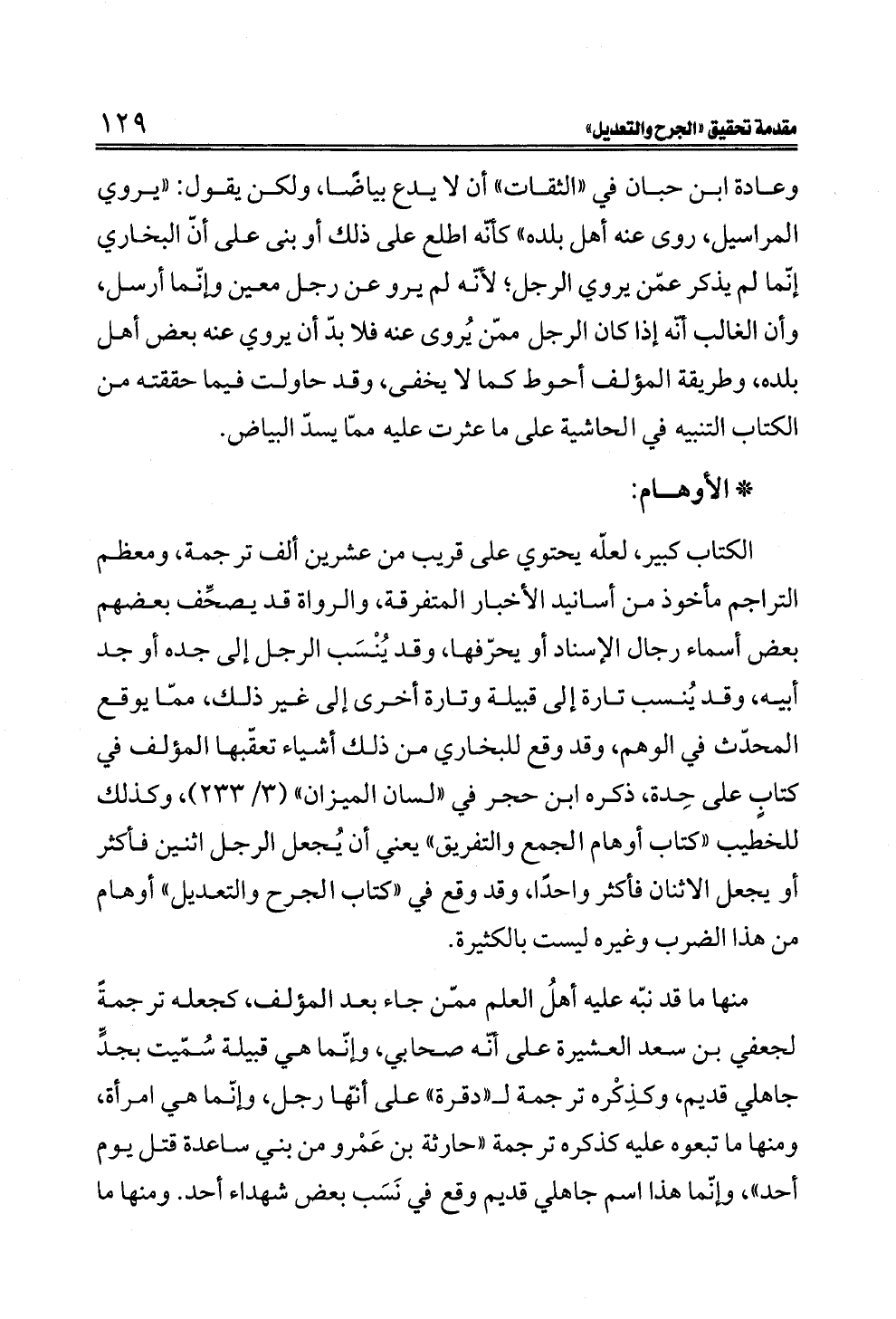 الكتاب كبير، لعلّه يحتوي على قريب من عشرين ألف ترجمة، ومعظم التراجم مأخوذ من أسانيد الأخبار المتفرقة، والرواة قد يصحِّف بعضهم بعض أسماء رجال الإسناد أو يحرّفها، وقد يُنْسَب الرجل إلى جده أو جد أبيه، وقد يُنسب تارة إلى قبيلة وتارة أخرى إلى غير ذلك، ممّا يوقع المحدّث في الوهم، وقد وقع للبخاري من ذلك أشياء تعقّبها المؤلف في كتابٍ على حِدة، ذكره ابن حجر في "لسان الميزان" (٣/ ٢٣٣)، وكذلك للخطيب "كتاب أوهام الجمع والتفريق" يعني أن يُجعل الرجل اثنين فأكثر أو يجعل الاثنان فأكثر واحدًا، وقد وقع في "كتاب الجرح والتعديل" أوهام من هذا الضرب وغيره ليست بالكثيرة.