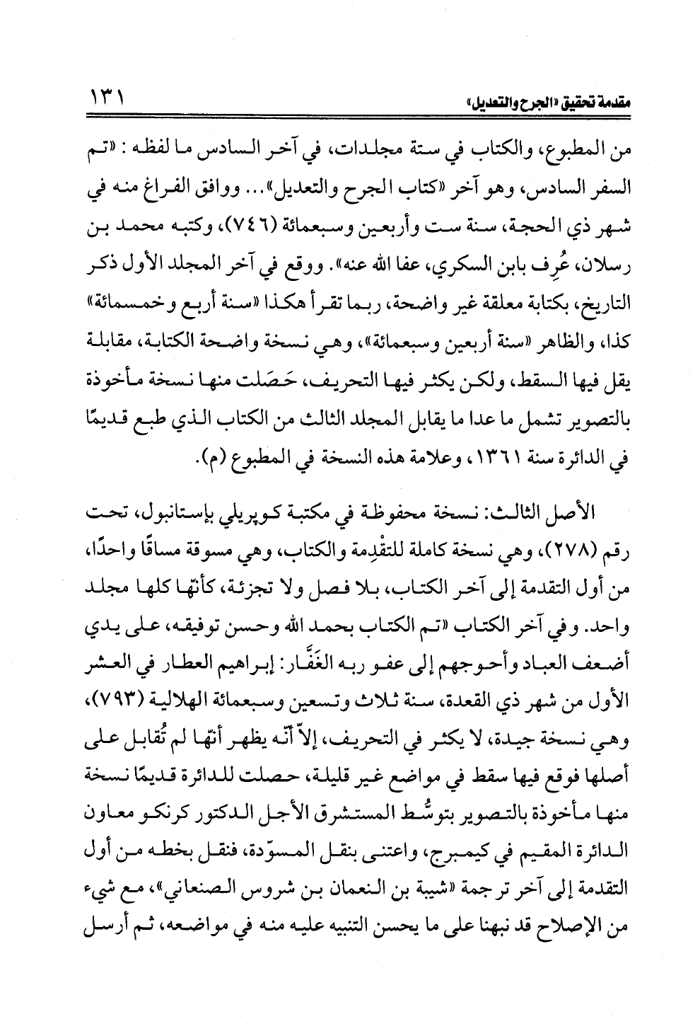 من المطبوع، والكتاب في ستة مجلدات، في آخر السادس ما لفظه: "تم السفر السادس، وهو آخر "كتاب الجرح والتعديل" ... ووافق الفراغ منه في شهر ذي الحجة، سنة ست وأربعين وسبعمائة (٧٤٦)، وكتبه محمد بن رسلان، عُرِف بابن السكري، عفا الله عنه". ووقع في آخر المجلد الأول ذكر التاريخ، بكتابة معلقة غير واضحة، ربما تقرأ هكذا "سنة أربع وخمسمائة" كذا، والظاهر "سنة أربعين وسبعمائة"، وهي نسخة واضحة الكتابة، مقابلة يقل فيها السقط، ولكن يكثر فيها التحريف، حَصَلت منها نسخة مأخوذة بالتصوير تشمل ما عدا ما يقابل المجلد الثالث من الكتاب الذي طبع قديمًا في الدائرة سنة ١٣٦١، وعلامة هذه النسخة في المطبوع (م).
