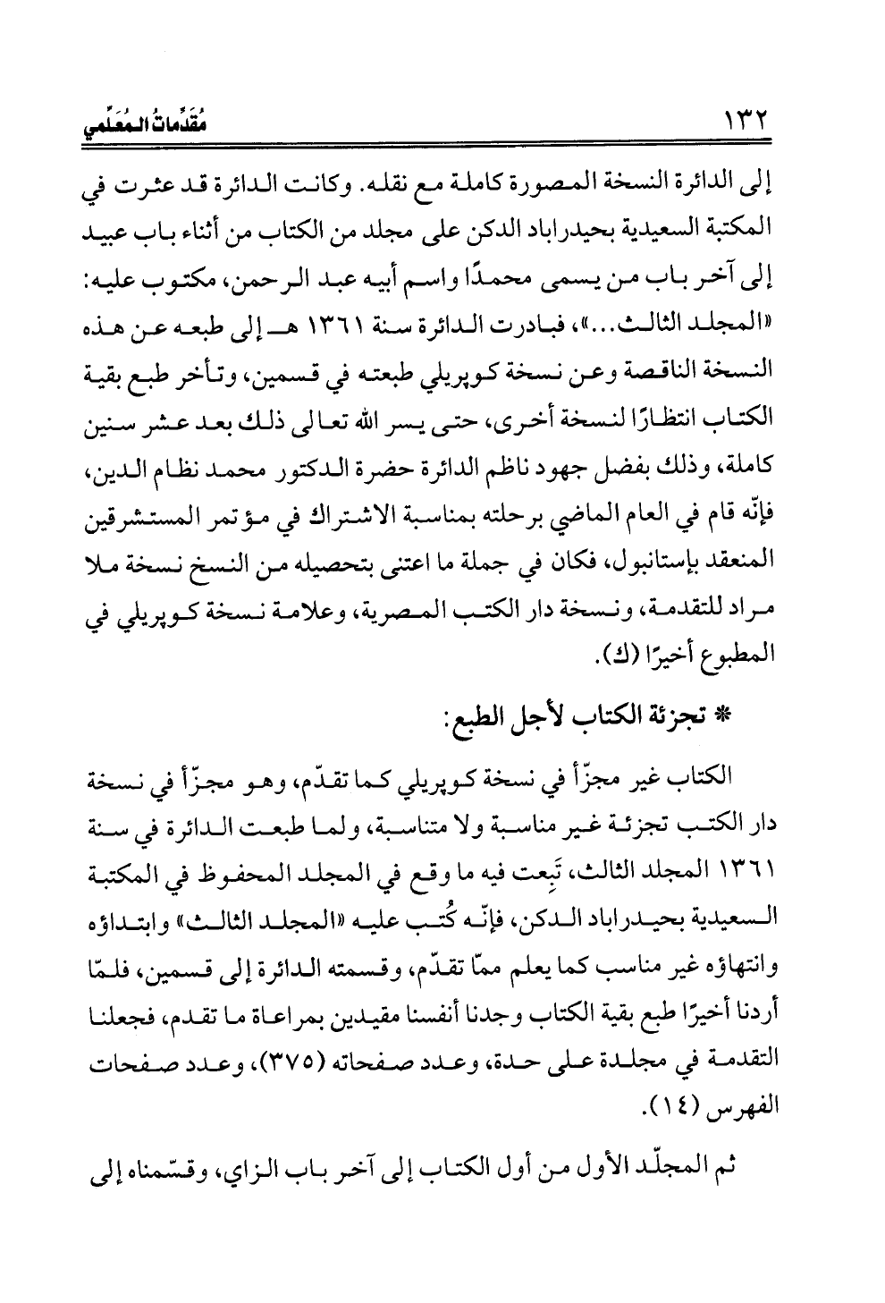 إلى الدائرة النسخة المصورة كاملة مع نقله. وكانت الدائرة قد عثرت في المكتبة السعيدية بحيدراباد الدكن على مجلد من الكتاب من أثناء باب عبيد إلى آخر باب من يسمى محمدًا واسم أبيه عبد الرحمن، مكتوب عليه: "المجلد الثالث ... "، فبادرت الدائرة سنة ١٣٦١ هـ إلى طبعه عن هذه النسخة الناقصة وعن نسخة كوبريلي طبعته في قسمين، وتأخر طبع بقية الكتاب انتظارًا لنسخة أخرى، حتى يسر الله تعالى ذلك بعد عشر سنين كاملة، وذلك بفضل جهود ناظم الدائرة حضرة الدكتور محمد نظام الدين، فإنّه قام في العام الماضي برحلته بمناسبة الاشتراك في مؤتمر المستشرقين المنعقد بإستانبول، فكان في جملة ما اعتنى بتحصيله من النسخ نسخة ملا مراد للتقدمة، ونسخة دار الكتب المصرية، وعلامة نسخة كوبريلي في المطبوع أخيرًا (ك).