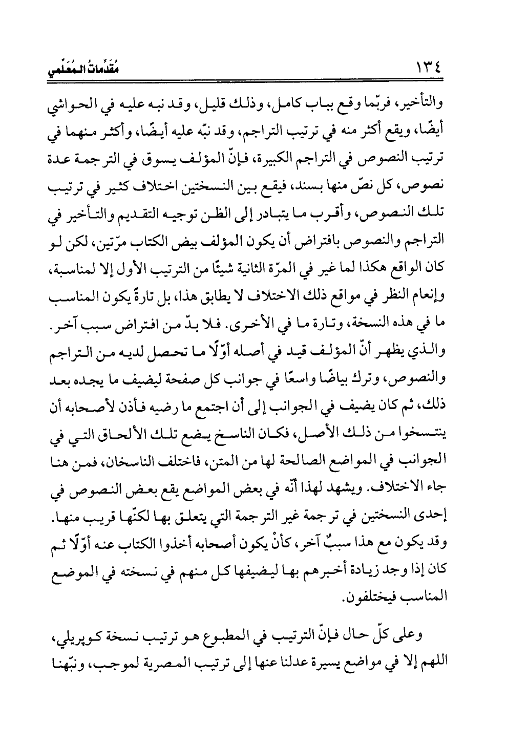 والتأخير، فربّما وقع بباب كامل، وذلك قليل، وقد نبه عليه في الحواشي أيضًا، ويقع أكثر منه في ترتيب التراجم، وقد نبّه عليه أيضًا، وأكثر منهما في ترتيب النصوص في التراجم الكبيرة، فإنّ المؤلف يسوق في الترجمة عدة نصوص، كل نصّ منها بسند، فيقع بين النسختين اختلاف كثير في ترتيب تلك النصوص، وأقرب ما يتبادر إلى الظن توجيه التقديم والتأخير في التراجم والنصوص بافتراض أن يكون المؤلف بيض الكتاب مرّتين، لكن لو كان الواقع هكذا لما غير في المرّة الثانية شيئًا من الترتيب الأول إلا لمناسبة، وإنعام النظر في مواقع ذلك الاختلاف لا يطابق هذا، بل تارةً يكون المناسب ما في هذه النسخة، وتارة ما في الأخرى. فلا بدّ من افتراض سبب آخر. والذي يظهر أنّ المؤلف قيد في أصله أوّلًا ما تحصل لديه من التراجم والنصوص، وترك بياضًا واسعًا في جوانب كل صفحة ليضيف ما يجده بعد ذلك، ثم كان يضيف في الجوانب إلى أن اجتمع ما رضيه فأذن لأصحابه أن ينتسخوا من ذلك الأصل، فكان الناسخ يضع تلك الألحاق التي في الجوانب في المواضع الصالحة لها من المتن، فاختلف الناسخان، فمن هنا جاء الاختلاف. ويشهد لهذا أنّه في بعض المواضع يقع بعض النصوص في إحدى النسختين في ترجمة غير الترجمة التي يتعلق بها لكنّها قريب منها. وقد يكون مع هذا سببٌ آخر، كأنْ يكون أصحابه أخذوا الكتاب عنه أوّلًا ثم كان إذا وجد زيادة أخبرهم بها ليضيفها كل منهم في نسخته في الموضع المناسب فيختلفون.