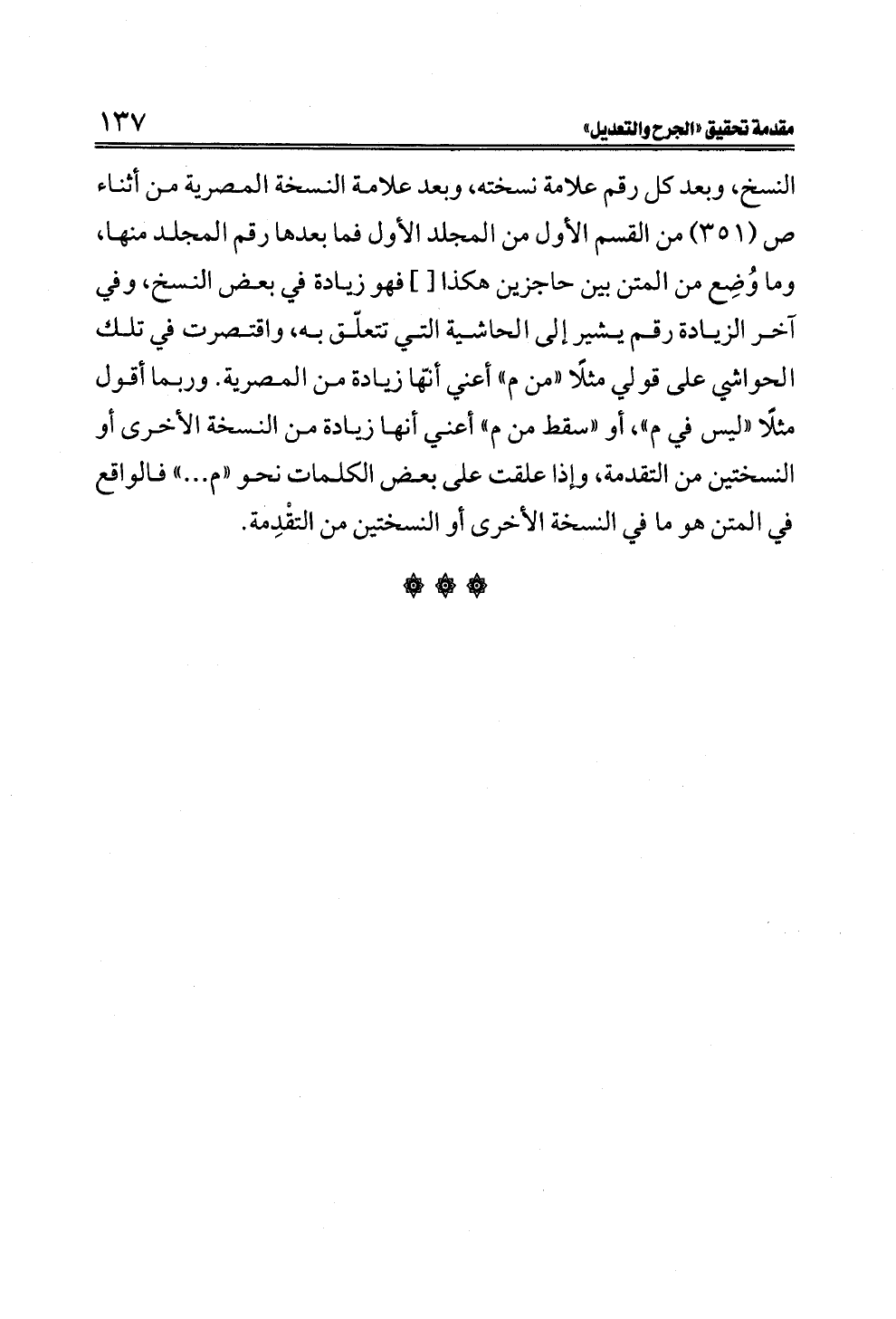 النسخ، وبعد كل رقم علامة نسخته، وبعد علامة النسخة المصرية من أثناء ص (٣٥١) من القسم الأول من المجلد الأول فما بعدها رقم المجلد منها، وما وُضِع من المتن بين حاجزين هكذا [] فهو زيادة في بعض النسخ، وفي آخر الزيادة رقم يشير إلى الحاشية التي تتعلّق به، واقتصرت في تلك الحواشي على قولي مثلًا "من م" أعني أنّها زيادة من المصرية. وربما أقول مثلًا "ليس في م"، أو "سقط من م" أعني أنها زيادة من النسخة الأخرى أو النسختين من التقدمة، وإذا علقت على بعض الكلمات نحو "م ... " فالواقع في المتن هو ما في النسخة الأخرى أو النسختين من التقْدِمة.