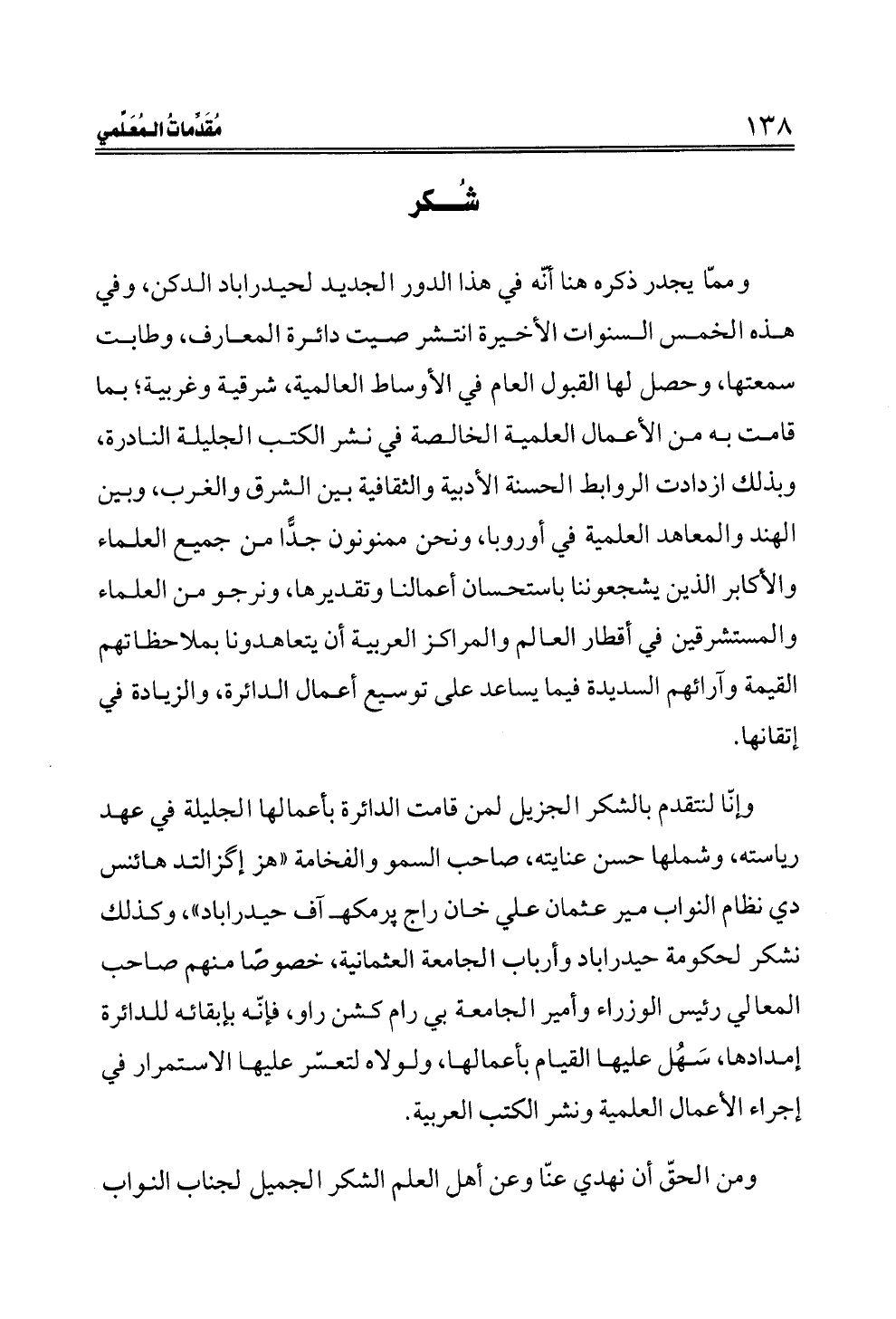 وإنّا لنتقدم بالشكر الجزيل لمن قامت الدائرة بأعمالها الجليلة في عهد رياسته، وشملها حسن عنايته، صاحب السمو والفخامة "هز إكزالتد هائنس دي نظام النواب مير عثمان علي خان راج پر مكهـ آف حيدراباد"، وكذلك نشكر لحكومة حيدراباد وأرباب الجامعة العثمانية، خصوصًا منهم صاحب المعالي رئيس الوزراء وأمير الجامعة بي رام كشن راو، فإنّه بإبقائه للدائرة إمدادها، سَهُل عليها القيام بأعمالها، ولولاه لتعسّر عليها الاستمرار في إجراء الأعمال العلمية ونشر الكتب العربية.