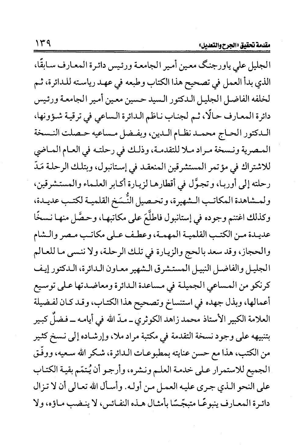 الجليل علي ياورجنك معين أمير الجامعة ورئيس دائرة المعارف سابقًا، الذي بدأ العمل في تصحيح هذا الكتاب وطبعه في عهد رياسته للدائرة، ثم لخلفه الفاضل الجليل الدكتور السيد حسين معين أمير الجامعة ورئيس دائرة المعارف حالًا، ثم لجناب ناظم الدائرة الساعي في ترقية شؤونها، الدكتور الحاج محمد نظام الدين، وبفضل مساعيه حصلت النسخة المصرية ونسخة مراد ملا للتقدمة، وذلك في رحلته في العام الماضي للاشتراك في مؤتمر المستشرقين المنعقد في إستانبول، وبتلك الرحلة مَدّ رحلته إلى أوربا، وتجوَّل في أقطارها لزيارة أكابر العلماء والمستشرقين، ولمشاهدة المكاتب الشهيرة، وتحصيل النُّسَخ القلمية لكتب عديدة، وكذلك اغتنم وجوده في إستانبول فاطلَّعَ على مكاتبها، وحصَّل منها نسخًا عديدة من الكتب القلمية المهمة، وعطف على مكاتب مصر والشام والحجاز، وقد سعد بالحج والزيارة في تلك الرحلة، ولا ننسى ما للعالم الجليل والفاضل النبيل المستشرق الشهير معاون الدائرة، الدكتور إيف كرنكو من المساعي الجميلة في مساعدة الدائرة ومعاضدتها على توسيع أعمالها، وبذل جهده في استنساخ وتصحيح هذا الكتاب، وقد كان لفضيلة العلامة الكبير الأستاذ محمد زاهد الكوثري ــ مدّ الله في أيامه ــ فضلٌ كبير بتنبيهه على وجود نسخة التقدمة في مكتبة مراد ملا، وإرشاده إلى نسخ كثير من الكتب، هذا مع حسن عنايته بمطبوعات الدائرة، شكر الله سعيه، ووفّق الجميع للاستمرار على خدمة العلم ونشره، وأرجو أن يُتمّم بقية الكتاب على النحو الذي جرى عليه العمل من أوله. وأسأل الله تعالى أن لا تزال دائرة المعارف ينبوعًا متبجّسًا بأمثال هذه النفائس، لا ينضب ماؤه، ولا