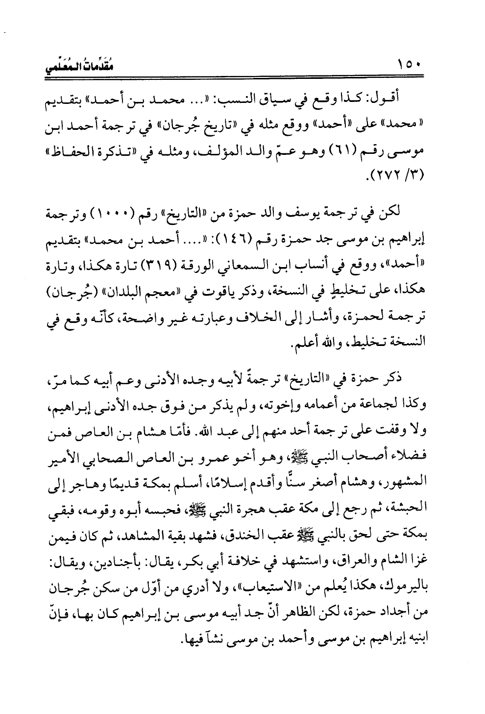 ذكر حمزة في "التاريخ" ترجمةً لأبيه وجده الأدنى وعم أبيه كما مرّ، وكذا لجماعة من أعمامه وإخوته، ولم يذكر من فوق جده الأدنى إبراهيم، ولا وقفت على ترجمة أحد منهم إلى عبد الله. فأمّا هشام بن العاص فمن فضلاء أصحاب النبي - صلى الله عليه وسلم - ، وهو أخو عمرو بن العاص الصحابي الأمير المشهور، وهشام أصغر سنًّا وأقدم إسلامًا، أسلم بمكة قديمًا وهاجر إلى الحبشة، ثم رجع إلى مكة عقب هجرة النبي - صلى الله عليه وسلم - ، فحبسه أبوه وقومه، فبقي بمكة حتى لحق بالنبي - صلى الله عليه وسلم - عقب الخندق، فشهد بقية المشاهد، ثم كان فيمن غزا الشام والعراق، واستشهد في خلافة أبي بكر، يقال: بأجنادين، ويقال: باليرموك، هكذا يُعلم من "الاستيعاب"، ولا أدري من أوّل من سكن جُرجان من أجداد حمزة، لكن الظاهر أنّ جد أبيه موسى بن إبراهيم كان بها، فإنّ ابنيه إبراهيم بن موسى وأحمد بن موسى نشآ فيها.