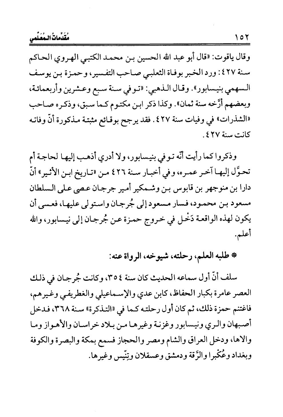 وذكروا كما رأيت أنّه توفي بنيسابور، ولا أدري أذهب إليها لحاجة أم تحوَّل إليها آخر عمره، وفي أخبار سنة ٤٢٦ من "تاريخ ابن الأثير" أنّ دارا بن منوجهر بن قابوس بن وشمكير أمير جرجان عصى على السلطان مسعود بن محمود، فسار مسعود إلى جُرجان واستولى عليها، فعسى أن يكون لهذه الواقعة دَخْل في خروج حمزة عن جُرجان إلى نيسابور، والله أعلم.