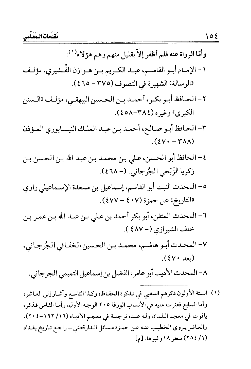(¬١) الستة الأولون ذكرهم الذهبي في تذكرة الحفاظ، وكذا التاسع وأشار إلى العاشر، وأما السابع فعثرت عليه في الأنساب الورقة ٢٠٥ الوجه الأول، وأما الثامن فذكره ياقوت في معجم البلدان وله عنده ترجمة في معجم الأدباء (١٦/ ١٩٢ - ٢٠٤)، والعاشر يروي الخطيب عنه عن حمزة مسائل الدارقطني ــ راجع تاريخ بغداد (١/ ٢٥٤) سطر ١٨ وغيرها. [م].