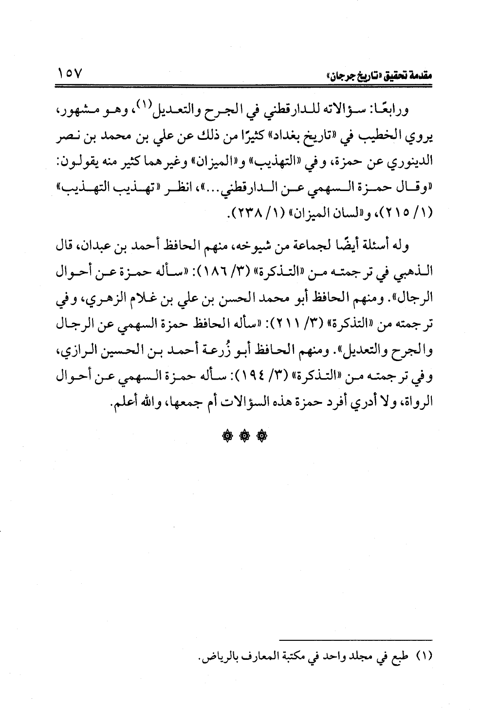 ورابعًا: سؤالاته للدارقطني في الجرح والتعديل (¬١)، وهو مشهور، يروي الخطيب في "تاريخ بغداد" كثيرًا من ذلك عن علي بن محمد بن نصر الدينوري عن حمزة، وفي "التهذيب" و"الميزان" وغيرهما كثير منه يقولون: "وقال حمزة السهمي عن الدارقطني ... "، انظر "تهذيب التهذيب" (١/ ٢١٥)، و"لسان الميزان" (١/ ٢٣٨).