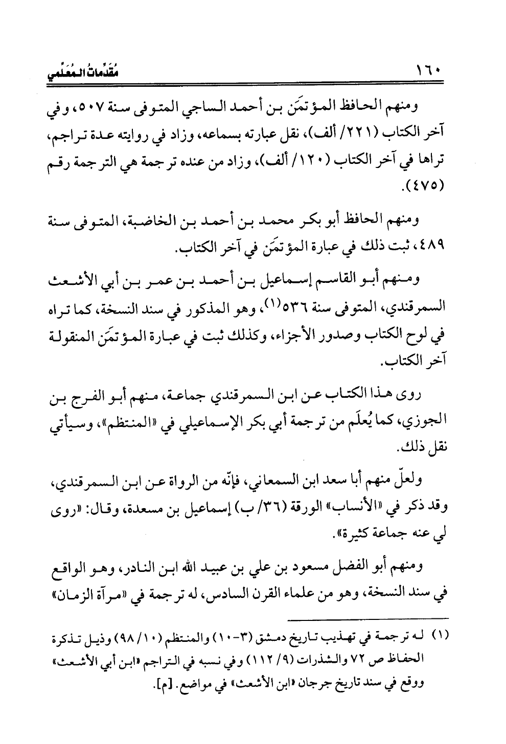ومنهم الحافظ المؤتَمَن بن أحمد الساجي المتوفى سنة ٥٠٧، وفي آخر الكتاب (٢٢١/ألف)، نقل عبارته بسماعه، وزاد في روايته عدة تراجم، تراها في آخر الكتاب (١٢٠/ألف)، وزاد من عنده ترجمة هي الترجمة رقم (٤٧٥).