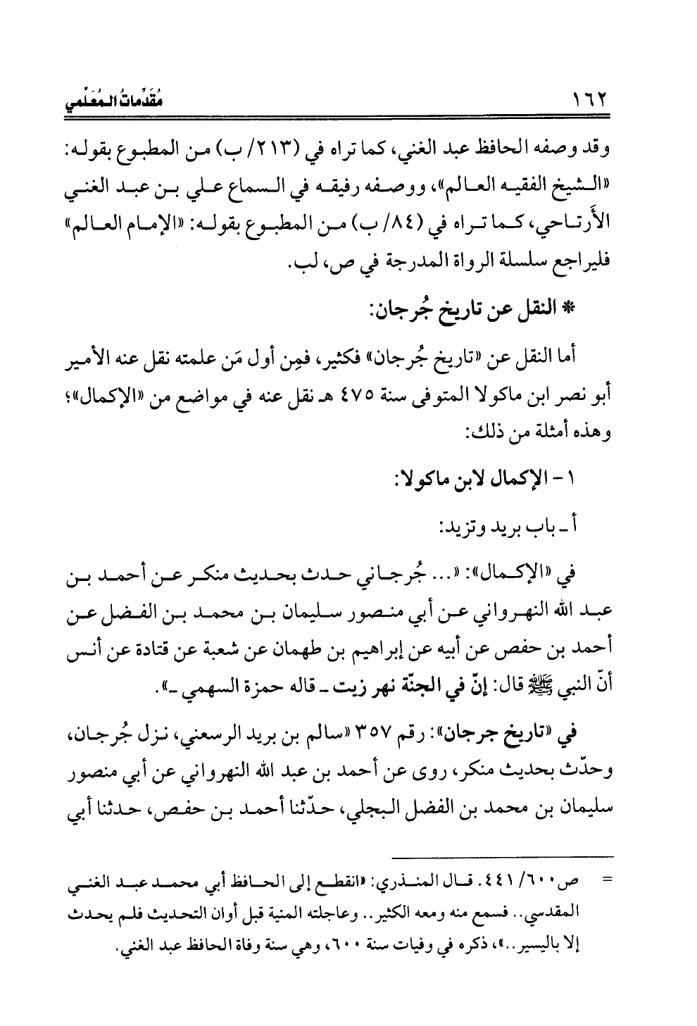 أما النقل عن "تاريخ جُرجان" فكثير، فمِن أول مَن علمته نقل عنه الأمير أبو نصر ابن ماكولا المتوفى سنة ٤٧٥ هـ نقل عنه في مواضع من "الإكمال"؛ وهذه أمثلة من ذلك: