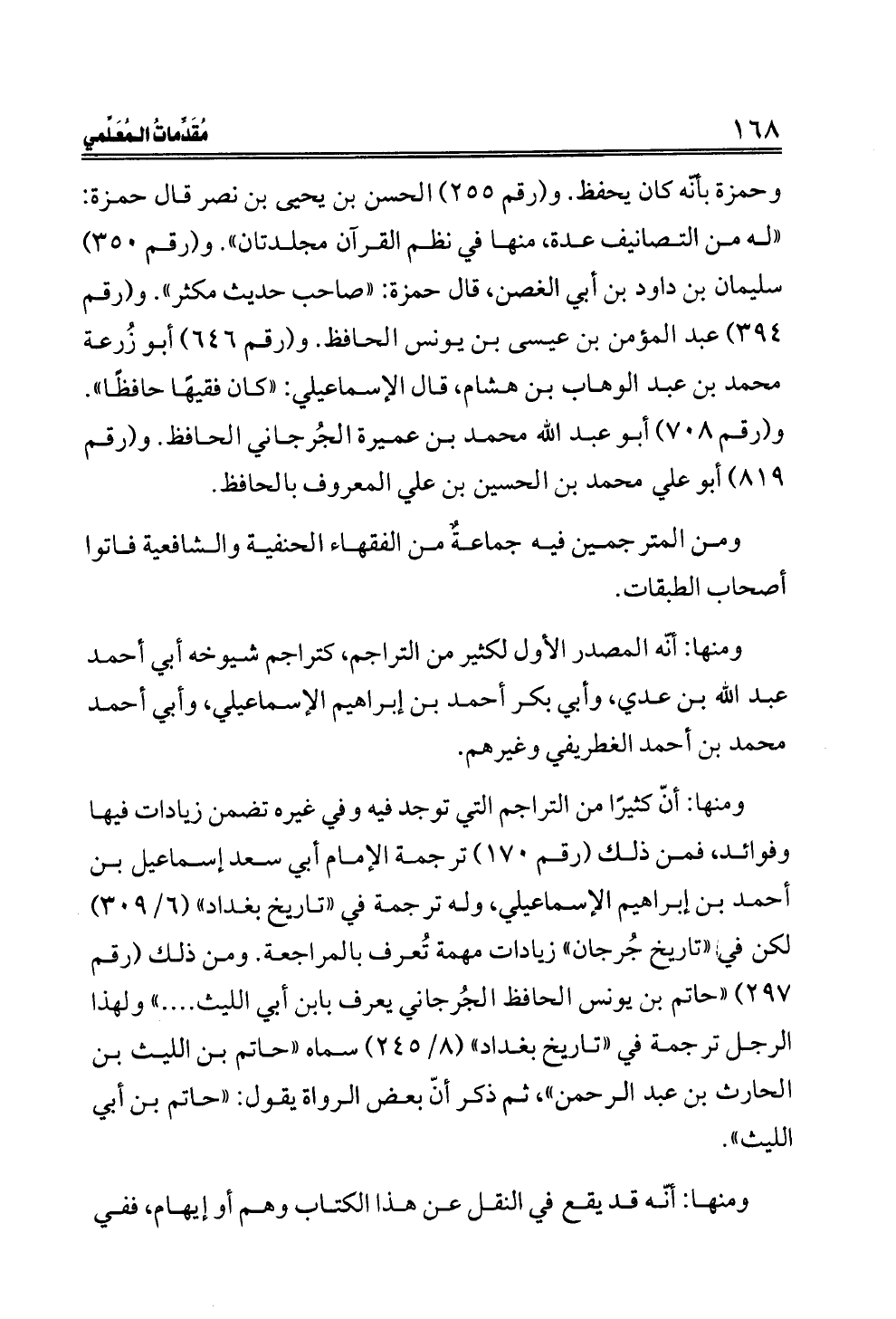 وحمزة بأنّه كان يحفظ. و (رقم ٢٥٥) الحسن بن يحيى بن نصر قال حمزة: "له من التصانيف عدة، منها في نظم القرآن مجلدتان". و (رقم ٣٥٠) سليمان بن داود بن أبي الغصن، قال حمزة: "صاحب حديث مكثر". و (رقم ٣٩٤) عبد المؤمن بن عيسى بن يونس الحافظ. و (رقم ٦٤٦) أبو زُرعة محمد بن عبد الوهاب بن هشام، قال الإسماعيلي: "كان فقيهًا حافظًا". و (رقم ٧٠٨) أبو عبد الله محمد بن عميرة الجُرجاني الحافظ. و (رقم ٨١٩) أبو علي محمد بن الحسين بن علي المعروف بالحافظ.