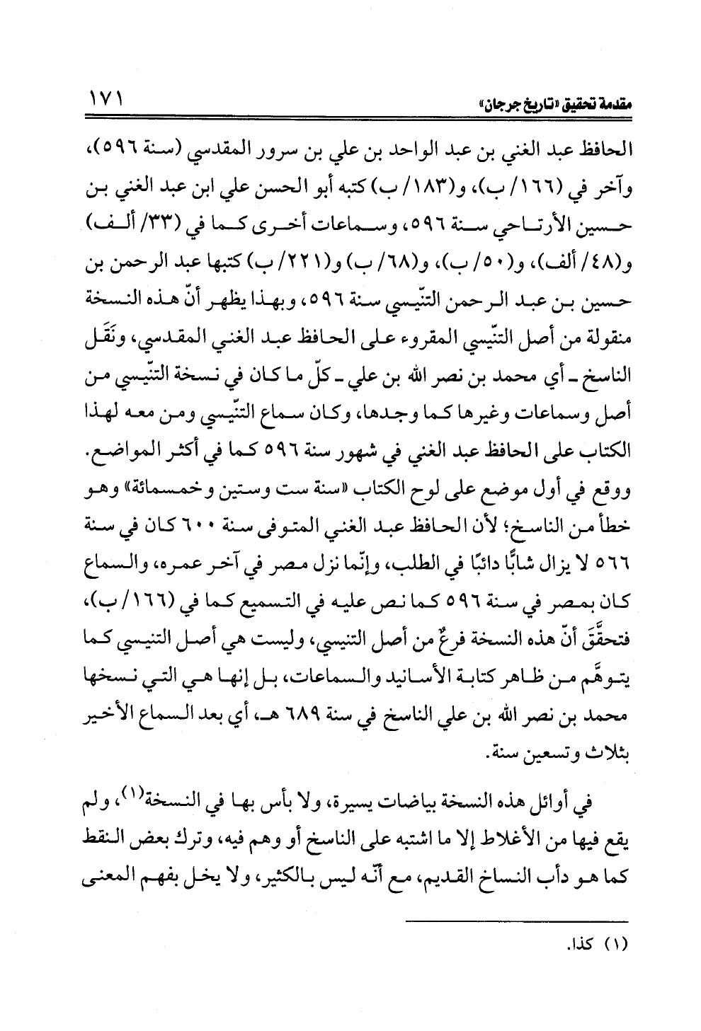 الحافظ عبد الغني بن عبد الواحد بن علي بن سرور المقدسي (سنة ٥٩٦)، وآخر في (١٦٦/ب)، و (١٨٣/ب) كتبه أبو الحسن علي ابن عبد الغني بن حسين الأرتاحي سنة ٥٩٦، وسماعات أخرى كما في (٣٣/ألف) و (٤٨/ألف)، و (٥٠/ب)، و (٦٨/ب) و (٢٢١/ب) كتبها عبد الرحمن بن حسين بن عبد الرحمن التنّيسي سنة ٥٩٦، وبهذا يظهر أنّ هذه النسخة منقولة من أصل التنّيسي المقروء على الحافظ عبد الغني المقدسي، ونَقَل الناسخ ــ أي محمد بن نصر الله بن علي ــ كلّ ما كان في نسخة التنّيسي من أصل وسماعات وغيرها كما وجدها، وكان سماع التنّيسي ومن معه لهذا الكتاب على الحافظ عبد الغني في شهور سنة ٥٩٦ كما في أكثر المواضع. ووقع في أول موضع على لوح الكتاب "سنة ست وستين وخمسمائة" وهو خطأ من الناسخ؛ لأن الحافظ عبد الغني المتوفى سنة ٦٠٠ كان في سنة ٥٦٦ لا يزال شابًّا دائبًا في الطلب، وإنّما نزل مصر في آخر عمره، والسماع كان بمصر في سنة ٥٩٦ كما نص عليه في التسميع كما في (١٦٦/ب)، فتحقَّقَ أنّ هذه النسخة فرعٌ من أصل التنيسي، وليست هي أصل التنيسي كما يتوهَّم من ظاهر كتابة الأسانيد والسماعات، بل إنها هي التي نسخها محمد بن نصر الله بن علي الناسخ في سنة ٦٨٩ هـ، أي بعد السماع الأخير بثلاث وتسعين سنة.
