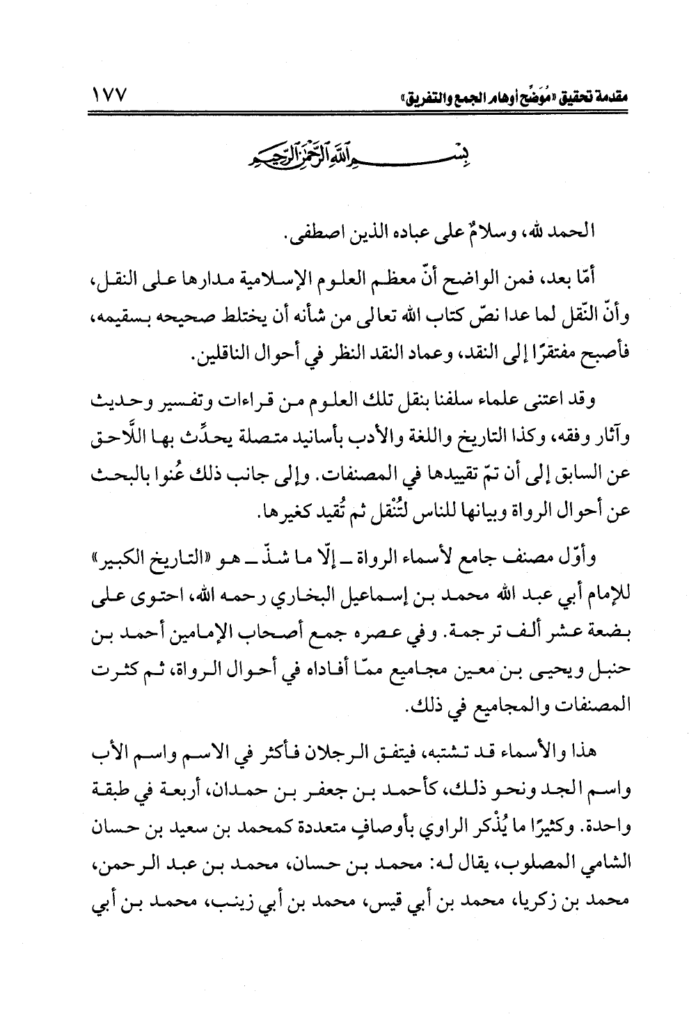 أمّا بعد، فمن الواضح أنّ معظم العلوم الإسلامية مدارها على النقل، وأنّ النّقل لما عدا نصّ كتاب الله تعالى من شأنه أن يختلط صحيحه بسقيمه، فأصبح مفتقرًا إلى النقد، وعماد النقد النظر في أحوال الناقلين.