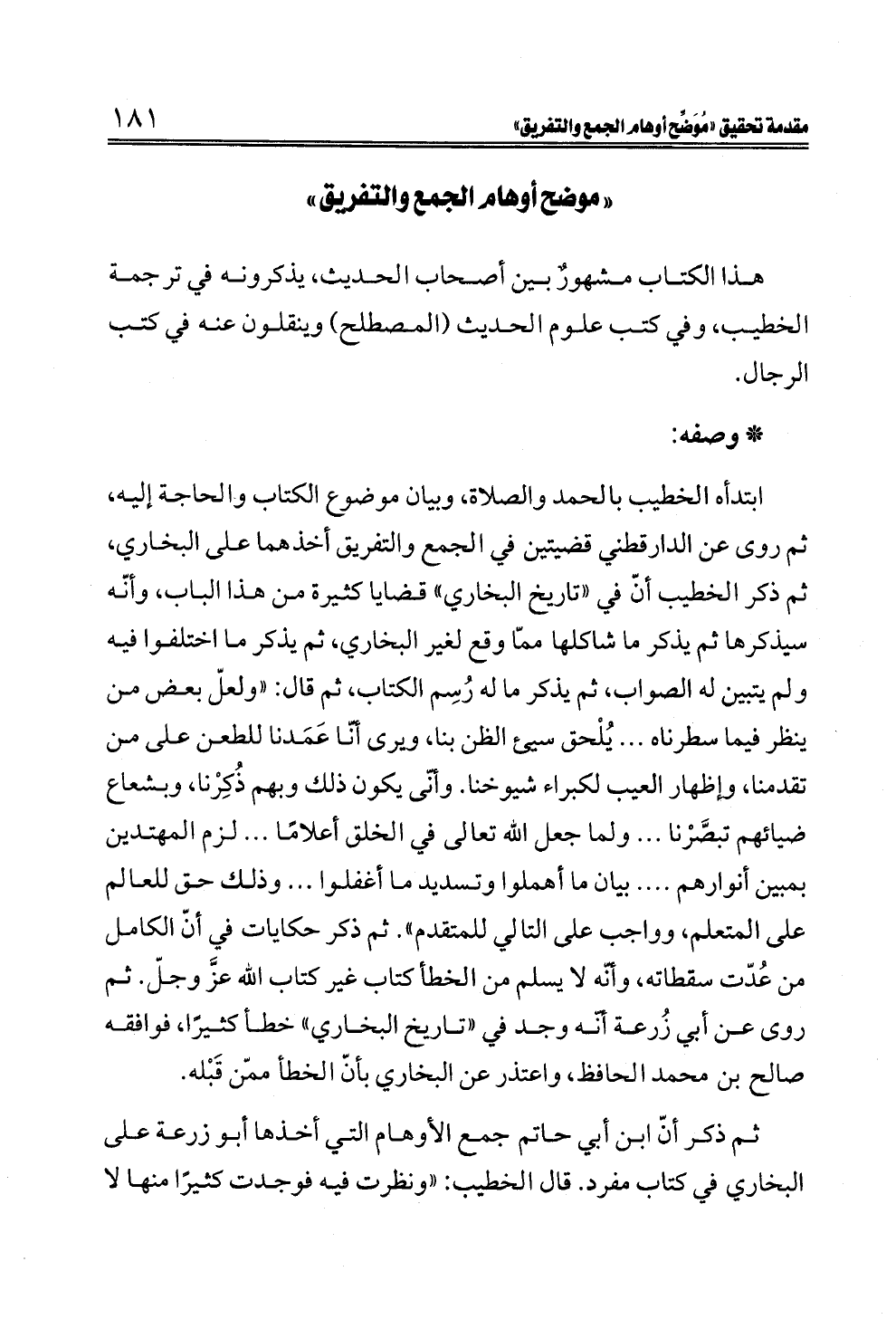 ابتدأه الخطيب بالحمد والصلاة، وبيان موضوع الكتاب والحاجة إليه، ثم روى عن الدارقطني قضيتين في الجمع والتفريق أخذهما على البخاري، ثم ذكر الخطيب أنّ في "تاريخ البخاري" قضايا كثيرة من هذا الباب، وأنّه سيذكرها ثم يذكر ما شاكلها ممّا وقع لغير البخاري، ثم يذكر ما اختلفوا فيه ولم يتبين له الصواب، ثم يذكر ما له رُسِم الكتاب، ثم قال: "ولعلّ بعض من ينظر فيما سطرناه ... يُلْحق سيئ الظن بنا، ويرى أنّا عَمَدنا للطعن على من تقدمنا، وإظهار العيب لكبراء شيوخنا. وأنّى يكون ذلك وبهم ذُكِرْنا، وبشعاع ضيائهم تبصَّرْنا ... ولما جعل الله تعالى في الخلق أعلامًا ... لزم المهتدين بمبين أنوارهم .... بيان ما أهملوا وتسديد ما أغفلوا ... وذلك حق للعالم على المتعلم، وواجب على التالي للمتقدم". ثم ذكر حكايات في أنّ الكامل من عُدّت سقطاته، وأنّه لا يسلم من الخطأ كتاب غير كتاب الله عزَّ وجلّ. ثم روى عن أبي زُرعة أنّه وجد في "تاريخ البخاري" خطأ كثيرًا، فوافقه صالح بن محمد الحافظ، واعتذر عن البخاري بأنّ الخطأ ممّن قَبْله.