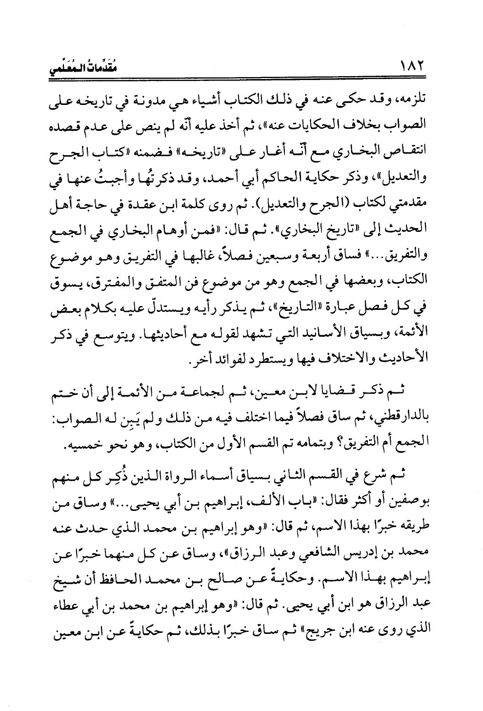 تلزمه، وقد حكى عنه في ذلك الكتاب أشياء هي مدونة في تاريخه على الصواب بخلاف الحكايات عنه"، ثم أخذ عليه أنّه لم ينص على عدم قصده انتقاص البخاري مع أنّه أغار على "تاريخه" فضمنه "كتاب الجرح والتعديل"، وذكر حكاية الحاكم أبي أحمد، وقد ذكرتُها وأجبتُ عنها في مقدمتي لكتاب (الجرح والتعديل). ثم روى كلمة ابن عقدة في حاجة أهل الحديث إلى "تاريخ البخاري". ثم قال: "فمن أوهام البخاري في الجمع والتفريق ... " فساق أربعة وسبعين فصلاً، غالبها في التفريق وهو موضوع الكتاب، وبعضها في الجمع وهو من موضوع فن المتفق والمفترق، يسوق في كل فصل عبارة "التاريخ"، ثم يذكر رأيه ويستدلّ عليه بكلام بعض الأئمة، وبسياق الأسانيد التي تشهد لقوله مع أحاديثها. ويتوسع في ذكر الأحاديث والاختلاف فيها ويستطرد لفوائد أخر.