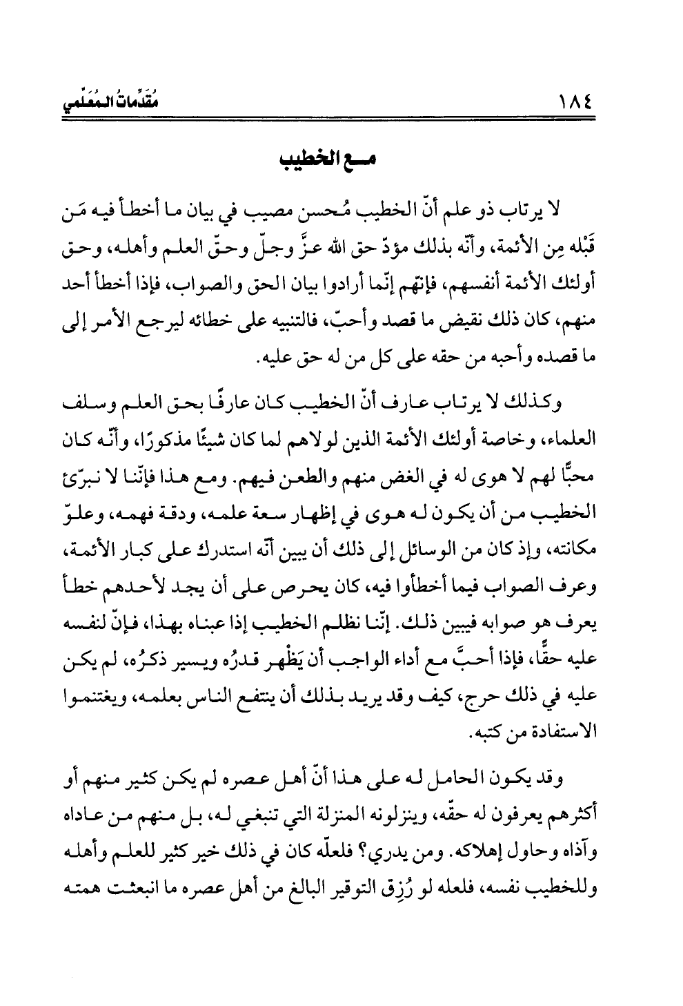 لا يرتاب ذو علم أنّ الخطيب مُحسن مصيب في بيان ما أخطأ فيه مَن قَبْله مِن الأئمة، وأنّه بذلك مؤدّ حق الله عزَّ وجلّ وحقّ العلم وأهله، وحق أولئك الأئمة أنفسهم، فإنّهم إنّما أرادوا بيان الحق والصواب، فإذا أخطأ أحد منهم، كان ذلك نقيض ما قصد وأحبّ، فالتنبيه على خطائه ليرجع الأمر إلى ما قصده وأحبه من حقه على كل من له حق عليه.