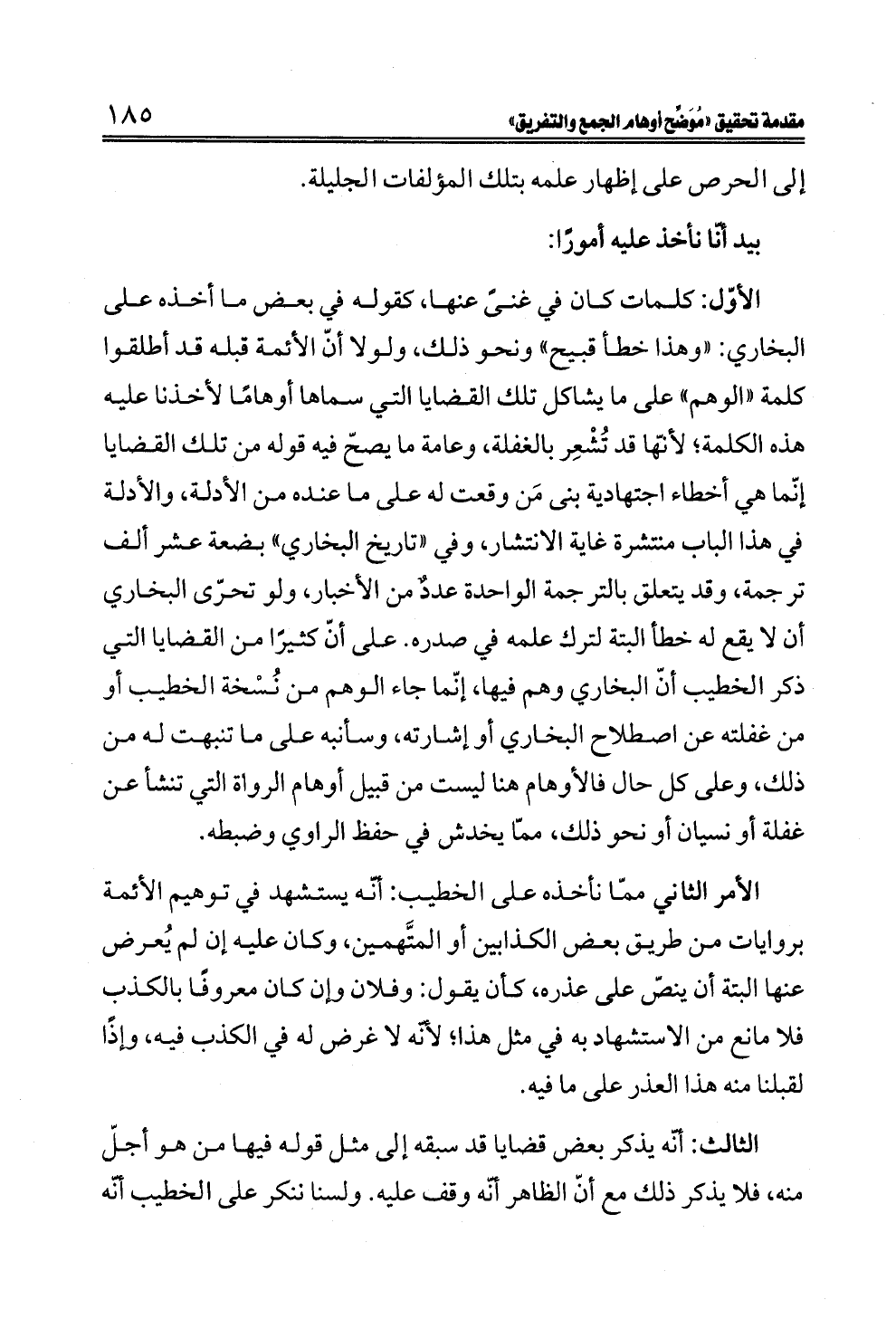 الأوّل: كلمات كان في غنىً عنها، كقوله في بعض ما أخذه على البخاري: "وهذا خطأ قبيح" ونحو ذلك، ولولا أنّ الأئمة قبله قد أطلقوا كلمة "الوهم" على ما يشاكل تلك القضايا التي سماها أوهامًا لأخذنا عليه هذه الكلمة؛ لأنّها قد تُشْعِر بالغفلة، وعامة ما يصحّ فيه قوله من تلك القضايا إنّما هي أخطاء اجتهادية بنى مَن وقعت له على ما عنده من الأدلة، والأدلة في هذا الباب منتشرة غاية الانتشار، وفي "تاريخ البخاري" بضعة عشر ألف ترجمة، وقد يتعلق بالترجمة الواحدة عددٌ من الأخبار، ولو تحرّى البخاري أن لا يقع له خطأ البتة لترك علمه في صدره. على أنّ كثيرًا من القضايا التي ذكر الخطيب أنّ البخاري وهم فيها، إنّما جاء الوهم من نُسْخة الخطيب أو من غفلته عن اصطلاح البخاري أو إشارته، وسأنبه على ما تنبهت له من ذلك، وعلى كل حال فالأوهام هنا ليست من قبيل أوهام الرواة التي تنشأ عن غفلة أو نسيان أو نحو ذلك، ممّا يخدش في حفظ الراوي وضبطه.