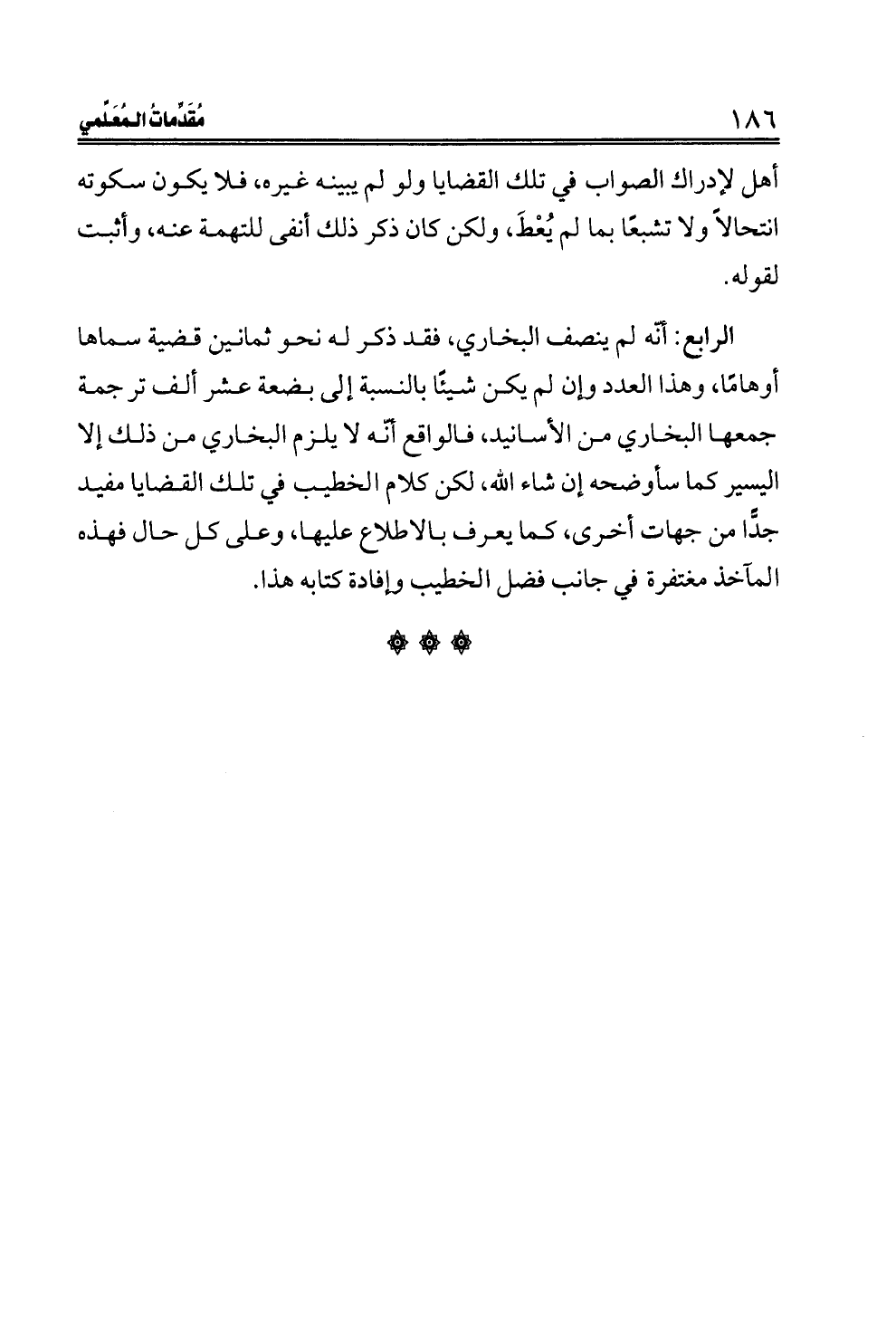 الرابع: أنّه لم ينصف البخاري، فقد ذكر له نحو ثمانين قضية سماها أوهامًا، وهذا العدد وإن لم يكن شيئًا بالنسبة إلى بضعة عشر ألف ترجمة جمعها البخاري من الأسانيد، فالواقع أنّه لا يلزم البخاري من ذلك إلا اليسير كما سأوضحه إن شاء الله، لكن كلام الخطيب في تلك القضايا مفيد جدًّا من جهات أخرى، كما يعرف بالاطلاع عليها، وعلى كل حال فهذه المآخذ مغتفرة في جانب فضل الخطيب وإفادة كتابه هذا.