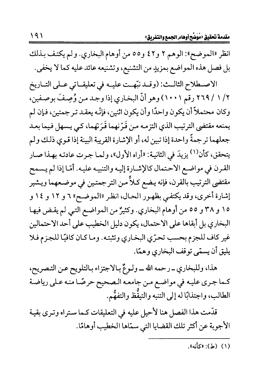 الاصطلاح الثالث: (وقد نبّهت عليه في تعليقاتي على التاريخ ٢/ ١ /٢٦٩ رقم ١٠٠١) وهو أنّ البخاري إذا وجد من وُصِفَ بوصفين، وكان محتملاً أن يكون واحدًا وأن يكون اثنين، فإنّه يعقد ترجمتين، فإن لم يمنعه مقتضى الترتيب الذي التزمه من قَرْنهما قَرَنَهما، كي يسهل فيما بعد جعلهما ترجمةً واحدة إذا تبين له، أو الإشارة القريبة البينة إذا قوي ذلك ولم يتحقق، كأن (¬١) يزيدَ في الثانية: "أراه الأول"، ولما جرت عادته بهذا صار القرن في مواضع الاحتمال كالإشارة إليه والتنبيه عليه. أمّا إذا لم يسمح مقتضى الترتيب بالقرن، فإنه يضع كلاًّ من الترجمتين في موضعهما ويشير إشارة أخرى، وقد يكتفي بظهور الحال، انظر "الموضح" ٦ و ١٢ و ١٤ و ١٥ و ٣٨ و ٥٥ من أوهام البخاري. وكثيرٌ من المواضع التي لم يقض فيها البخاري بل أبقاها على الاحتمال، يكون دليل الخطيب على أحد الاحتمالين غير كاف للجزم بحسب تحرّي البخاري وتثبته. وما كان كافيًا للجزم فلا يليق أن يسمّى توقف البخاري وهمًا.