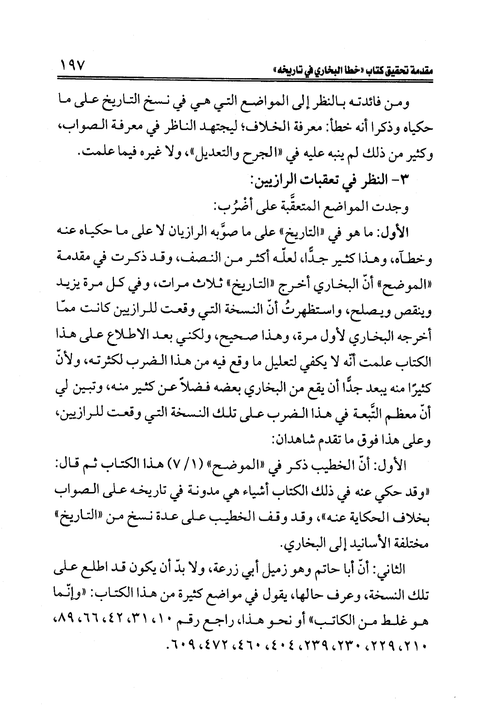 الأول: ما هو في "التاريخ" على ما صوَّبه الرازيان لا على ما حكياه عنه وخطآه، وهذا كثير جدًّا، لعلّه أكثر من النصف، وقد ذكرت في مقدمة "الموضح" أنّ البخاري أخرج "التاريخ" ثلاث مرات، وفي كل مرة يزيد وينقص ويصلح، واستظهرتُ أنّ النسخة التي وقعت للرازيين كانت ممّا أخرجه البخاري لأول مرة، وهذا صحيح، ولكني بعد الاطلاع على هذا الكتاب علمت أنّه لا يكفي لتعليل ما وقع فيه من هذا الضرب لكثرته، ولأنّ كثيرًا منه يبعد جدًّا أن يقع من البخاري بعضه فضلاً عن كثير منه، وتبين لي أنّ معظم التَّبعة في هذا الضرب على تلك النسخة التي وقعت للرازيين، وعلى هذا فوق ما تقدم شاهدان: