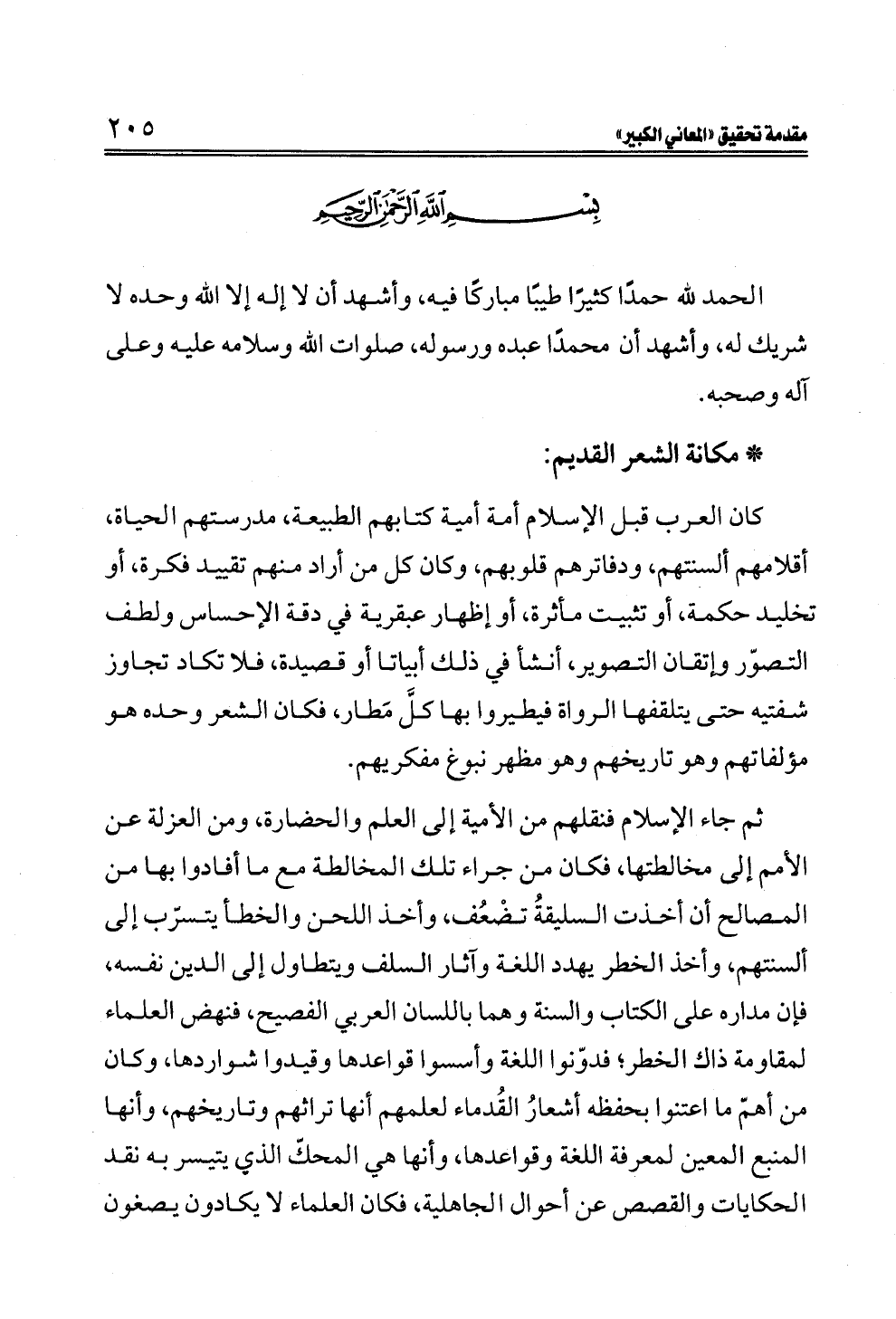 ثم جاء الإسلام فنقلهم من الأمية إلى العلم والحضارة، ومن العزلة عن الأمم إلى مخالطتها، فكان من جراء تلك المخالطة مع ما أفادوا بها من المصالح أن أخذت السليقةُ تضْعُف، وأخذ اللحن والخطأ يتسرّب إلى ألسنتهم، وأخذ الخطر يهدد اللغة وآثار السلف ويتطاول إلى الدين نفسه، فإن مداره على الكتاب والسنة وهما باللسان العربي الفصيح، فنهض العلماء لمقاومة ذاك الخطر؛ فدوّنوا اللغة وأسسوا قواعدها وقيدوا شواردها، وكان من أهمّ ما اعتنوا بحفظه أشعارُ القُدماء لعلمهم أنها تراثهم وتاريخهم، وأنها المنبع المعين لمعرفة اللغة وقواعدها، وأنها هي المحكّ الذي يتيسر به نقد الحكايات والقصص عن أحوال الجاهلية، فكان العلماء لا يكادون يصغون