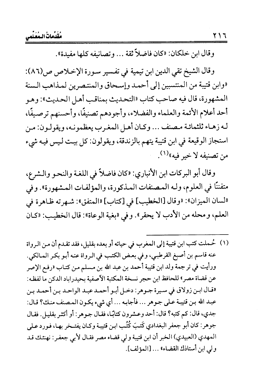 وقال الشيخ تقي الدين ابن تيمية في تفسير سورة الإخلاص ص (٨٦): "وابن قتيبة من المنتسبين إلى أحمد وإسحاق والمنتصرين لمذاهب السنة المشهورة، قال فيه صاحب كتاب "التحديث بمناقب أهل الحديث": وهو أحد أعلام الأئمة والعلماء والفضلاء، وأجودهم تصنيفًا، وأحسنهم ترصيفًا، له زهاء ثلثمائة مصنف ... وكان أهل المغرب يعظمونه، ويقولون: من استجاز الوقيعة في ابن قتيبة يتهم بالزندقة، ويقولون: كل بيت ليس فيه شيء من تصنيفه لا خير فيه" (¬١).