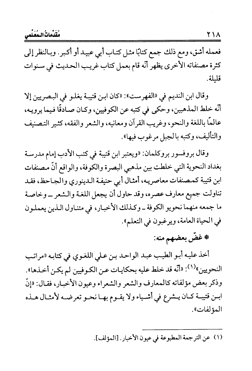 وقال بروفسور بروكلمان: "ويعتبر ابن قتيبة في كتب الأدب إمام مدرسة بغداد النحوية التي خلطت بين مذهبي البصرة والكوفة، والواقع أنّ مصنفات ابن قتيبة كمصنفات معاصريه، أمثال أبي حنيفة الدينوري والجاحظ، فقد تناولت جميع معارف عصره، وقد حاول أن يجعل اللغة والشعر ــ وخاصة ما جمعه منهما نحويو الكوفة ــ وكذلك الأخبار، في متناول الذين يعملون في الحياة العامة، ويرغبون في التعلم".