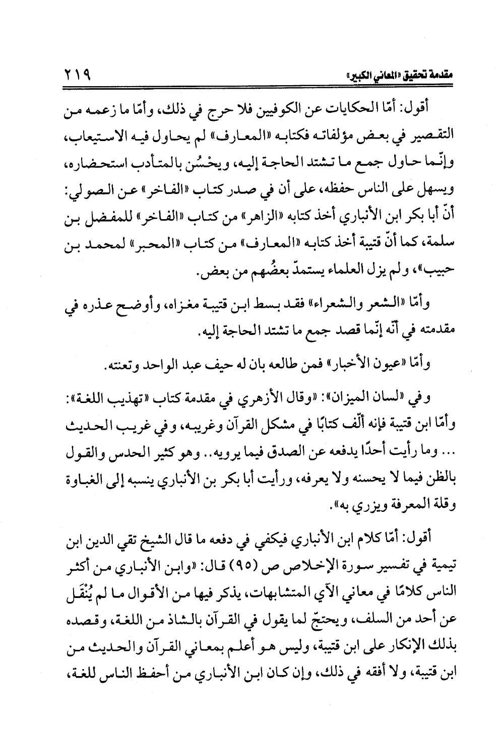 أقول: أمّا الحكايات عن الكوفيين فلا حرج في ذلك، وأمّا ما زعمه من التقصير في بعض مؤلفاته فكتابه "المعارف" لم يحاول فيه الاستيعاب، وإنّما حاول جمع ما تشتد الحاجة إليه، ويحْسُن بالمتأدب استحضاره، ويسهل على الناس حفظه، على أن في صدر كتاب "الفاخر" عن الصولي: أنّ أبا بكر ابن الأنباري أخذ كتابه "الزاهر" من كتاب "الفاخر" للمفضل بن سلمة، كما أنّ قتيبة أخذ كتابه "المعارف" من كتاب "المحبر" لمحمد بن حبيب"، ولم يزل العلماء يستمدّ بعضُهم من بعض.