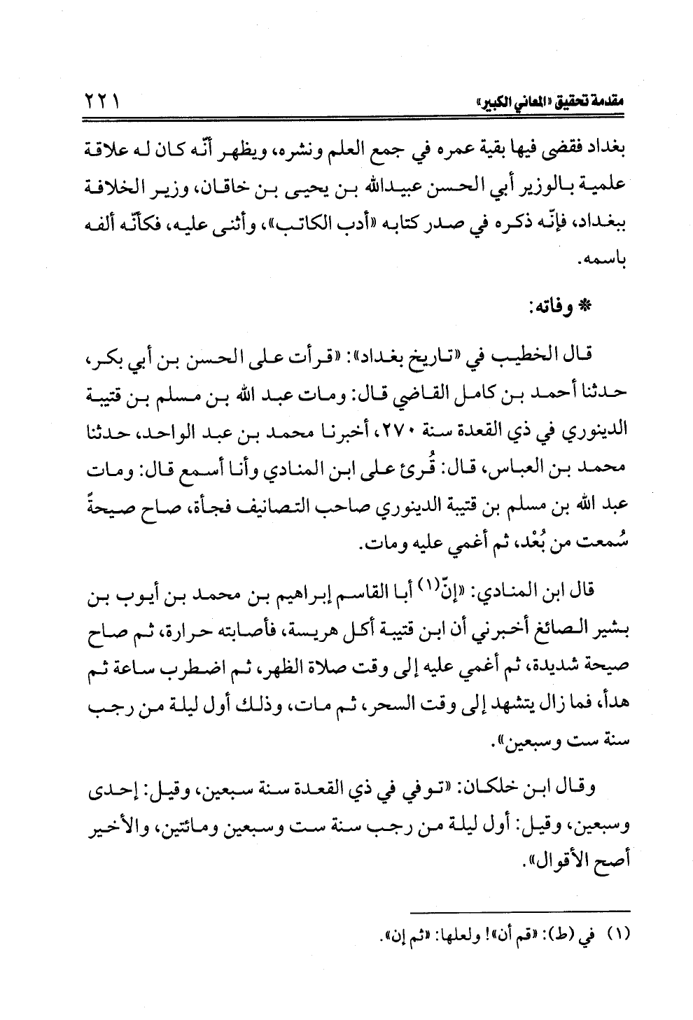 قال ابن المنادي: "إنّ (¬١) أبا القاسم إبراهيم بن محمد بن أيوب بن بشير الصائغ أخبرني أن ابن قتيبة أكل هريسة، فأصابته حرارة، ثم صاح صيحة شديدة، ثم أغمي عليه إلى وقت صلاة الظهر، ثم اضطرب ساعة ثم هدأ، فما زال يتشهد إلى وقت السحر، ثم مات، وذلك أول ليلة من رجب سنة ست وسبعين".