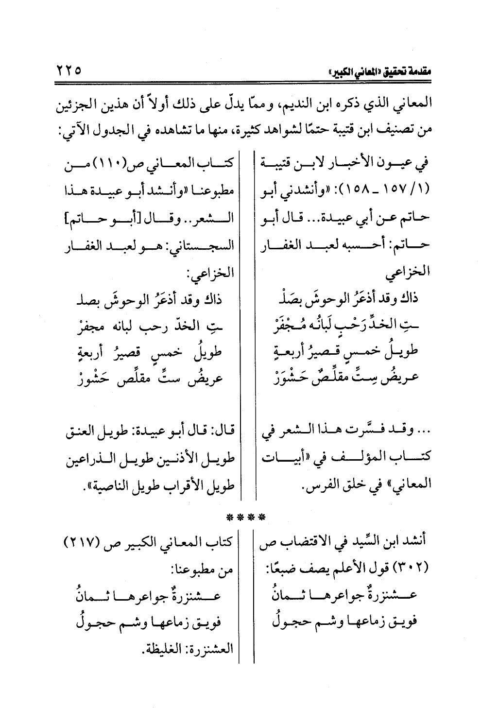 في عيون الأخبار لابن قتيبة (١/ ١٥٧ ــ ١٥٨): "وأنشدني أبو حاتم عن أبي عبيدة . . . قال أبو حاتم: أحسبه لعبد الغفار الخزاعيذاك وقد أذعَرُ الوحوشَ بصَلْــتِ الخدِّ رَحْبٍ لَبانُه مُجْفَرْطويلُ خمسٍ قصيرُ أربعةٍعريضُ سِتِّ مقلِّصٌ حَشْوَرْوقد فسَّرت هذا الشعر في كتاب المؤلف في "أبيات المعاني" في خلق الفرس. كتاب المعاني ص (١١٠) من مطبوعنا "وأنشد أبو عبيدة هذا الشعر .. وقال [أبو حاتم] السجستاني: هو لعبد الغفار الخزاعي:ذاك وقد أذعَرُ الوحوشَ بصلــتِ الخدّ رحب لبانه مجفرْطويلُ خمسٍ قصيرُ أربعةٍعريضُ ستِّ مقلِّص حَشْورْقال: قال أبو عبيدة: طويل العنق طويل الأذنين طويل الذراعين طويل الأقراب طويل الناصية".