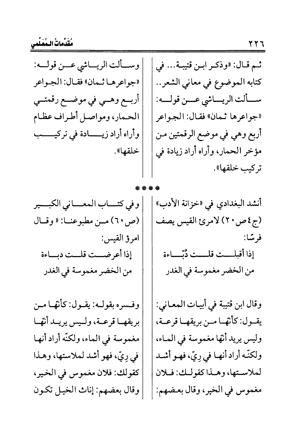 ثم قال: "وذكر ابن قتيبة في كتابه الموضوع في معاني الشعر .. سألت الرياشي عن قوله: "جواعرها ثمان" فقال: الجواعر أربع وهي في موضع الرقمتين من مؤخر الحمار، وأراه أراد زيادة في تركيب خلقها". وسألت الرياشي عن قوله: "جواعرها ثمان" فقال: الجواعر أربع وهي في موضع رقمتي الحمار، ومواصل أطراف عظام وأراه أراد زيادة في تركيب خلقها".