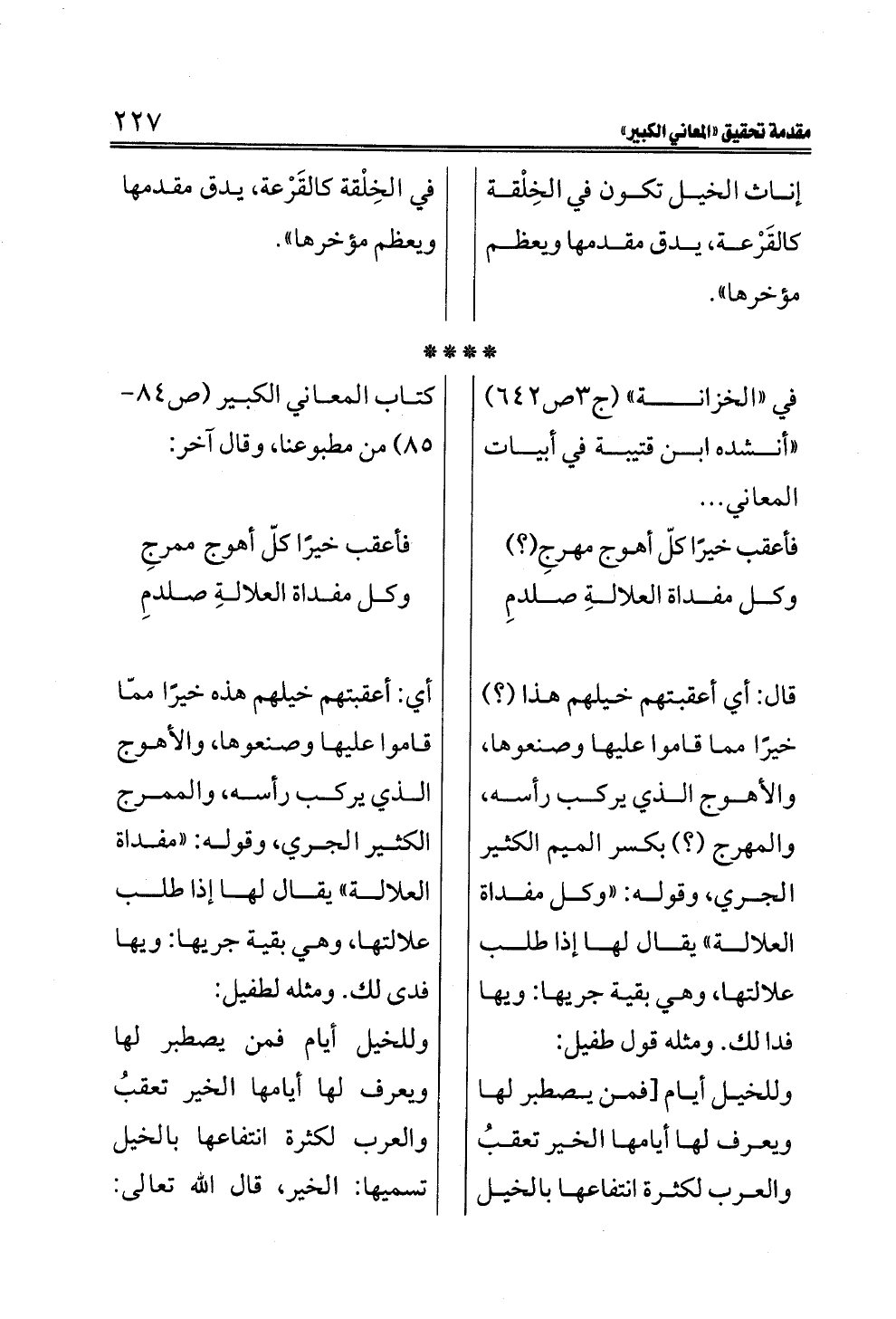 في "الخزانة" (ج ٣ ص ٦٤٢) "أنشده ابن قتيبة في أبيات المعاني. . . فأعقب خيرًا كلّ أهوج مهرجِ (؟) وكل مفداة العلالةِ صلدمِقال: أي أعقبتهم خيلهم هذا (؟) خيرًا مما قاموا عليها وصنعوها، والأهوج الذي يركب رأسه، والمهرج (؟) بكسر الميم الكثير الجري، وقوله: "وكل مفداة العلالة" يقال لها إذا طلب علالتها، وهي بقية جريها: ويها فدا لك. ومثله قول طفيل: وللخيل أيام [فمن يصطبر لها ويعرف لها أيامها الخير تعقبُ والعرب لكثرة انتفاعها بالخيل كتاب المعاني الكبير (ص ٨٤ - ٨٥) من مطبوعنا، وقال آخر: فأعقب خيرًا كلّ أهوج ممرجِوكل مفداة العلالةِ صلدمِأي: أعقبتهم خيلهم هذه خيرًا ممّا قاموا عليها وصنعوها، والأهوج الذي يركب رأسه، والممرج الكثير الجري، وقوله: "مفداة العلالة" يقال لها إذا طلب علالتها، وهي بقية جريها: ويها فدى لك. ومثله لطفيل: وللخيل أيام فمن يصطبر لها ويعرف لها أيامها الخير تعقبُ والعرب لكثرة انتفاعها بالخيل تسميها: الخير، قال الله تعالى: