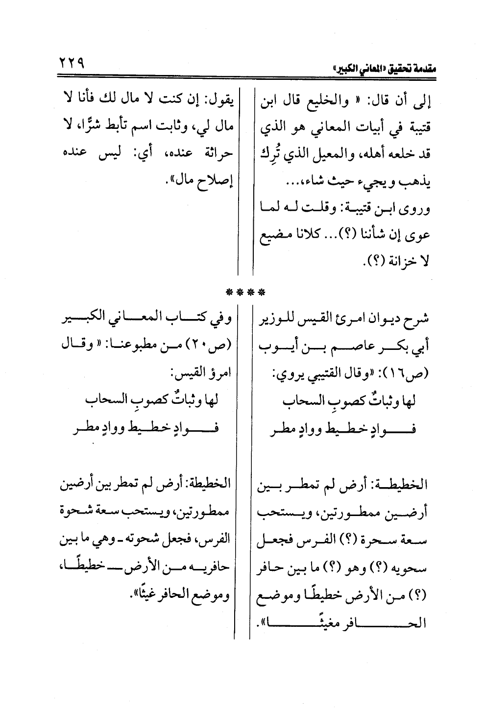 شرح ديوان امرئ القيس للوزير أبي بكر عاصم بن أيوب (ص ١٦): "وقال القتيبي يروي: لها وثباتٌ كصوبِ السحاب ... لها وثباتٌ كصوبِ السحاب فوادٍ خطيط ووادٍ مطر ... فوادٍ خطيط ووادٍ مطر الخطيطة: أرض لم تمطر بين أرضين ممطورتين، ويستحب سعة سحرة (؟) الفرس فجعل سحويه (؟) وهو (؟) ما بين حافر (؟) من الأرض خطيطًا وموضع الحافر مغيثًا". وفي كتاب المعاني الكبير (ص ٢٠) من مطبوعنا: " وقال امرؤ القيس: لها وثباتٌ كصوبِ السحاب ... فوادٍ خطيط ووادٍ مطر الخطيطة: أرض لم تمطر بين أرضين ممطورتين، ويستحب سعة شحوة الفرس، فجعل شحوته ــ وهي ما بين حافريه من الأرض ــ خطيطًا، وموضع الحافر غيثًا".