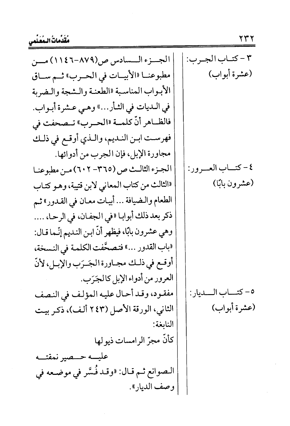٣ - كتاب الجرب (عشرة أبواب) : الجزء السادس ص (٨٧٩ - ١١٤٦) من مطبوعنا "الأبيات في الحرب" ثم ساق الأبواب المناسبة "الطعنة والشجة والضربة في الديات في الثأر . . . " وهي عشرة أبواب. فالظاهر أنّ كلمة "الحرب" تصحفت في فهرست ابن النديم، والذي أوقع في ذلك مجاورة الإبل، فإن الجرب من أدوائها. ٤ - كتاب العرور(عشرون بابًا) : الجزء الثالث ص (٣٦٥ - ٦٠٢) من مطبوعنا "الثالث من كتاب المعاني لابن قتيبة، وهو كتاب الطعام والضيافة . . . أبيات معان في القدور" ثم ذكر بعد ذلك أبوابا "في الجفان، في الرحا، . . . . وهي عشرون بابًا، فيظهر أنّ ابن النديم إنّما قال: "باب القدور .. . " فتصحَّفت الكلمة في النسخة، أوقع في ذلك مجاورة الجَرَب والإبل، لأنّ العرور من أدواء الإبل كالجَرَب. ٥ - كتاب الديار(عشرة أبواب) : مفقود، وقد أحال عليه المؤلف في النصف الثاني، الورقة الأصل (٢٤٣ ألف)، ذكر بيت النابغة: كأنّ مجرّ الرامسات ذيولها ... عليه حصير نمقته الصوانع ثم قال: "وقد فُسَّر في موضعه في وصف الديار".