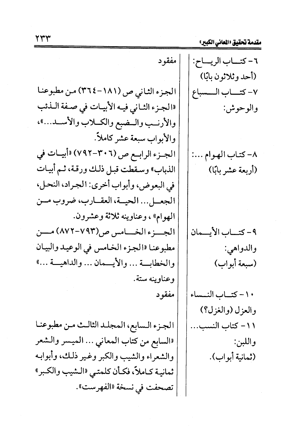 ٦ - كتاب الرياح (أحد وثلاثون بابًا): مفقود ٧ - كتاب السباع والوحوش: الجزء الثاني ص (١٨١ - ٣٦٤) من مطبوعنا "الجزء الثاني فيه الأبيات في صفة الذئب والأرنب والضبع والكلاب والأسد . . . "، والأبواب سبعة عشر كاملاً.٨ - كتاب الهوام (أربعة عشر بابًا) : الجزء الرابع ص (٣٠٦ - ٧٩٢) "أبيات في الذباب" وسقطت قبل ذلك ورقة، ثم أبيات في البعوض، وأبواب أخرى: الجراد، النحل، الجعل . . . الحية، العقارب، ضروب من الهوام"، وعناوينه ثلاثة وعشرون. ٩ - كتاب الأيمان والدواهي . (سبعة أبواب): الجزء الخامس ص (٧٩٣ - ٨٧٢) من مطبوعنا "الجزء الخامس في الوعيد والبيان والخطابة . . . والأيمان . . . والداهية . . . " وعناوينه ستة. ١٠ - كتاب النساء والعزل (والغزل؟ ) مفقود١١ - كتاب النسب . . . واللبن (ثمانية أبواب). : الجزء السابع، المجلد الثالث من مطبوعنا "السابع من كتاب المعاني . . . الميسر والشعر والشعراء والشيب والكبر وغير ذلك، وأبوابه ثمانية كاملاً، فكأن كلمتي "الشيب والكبر" تصحفت في نسخة "الفهرست".